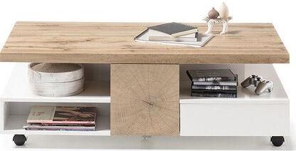Stolik kawowy RENNES wyróżnia się nowoczesną bardzo ciekawą formą. Duża ilość schowków zapewnia przestrzeń do przechowywania wszelakich przedmiotów. Mebel wyposażony jest w kółka, które umożliwiają przesuwanie go w dowolne miejsce. Stolik RENNES wykonany jest z płyty MDF w połączeniu z blatem z folii strukturalnej. Ponadczasowa jasna kolorystyka bieli i dębu sprawia, że stolik odnajdzie się w wielu aranżacjach wnętrzProdukt posiada wiele wariantów.