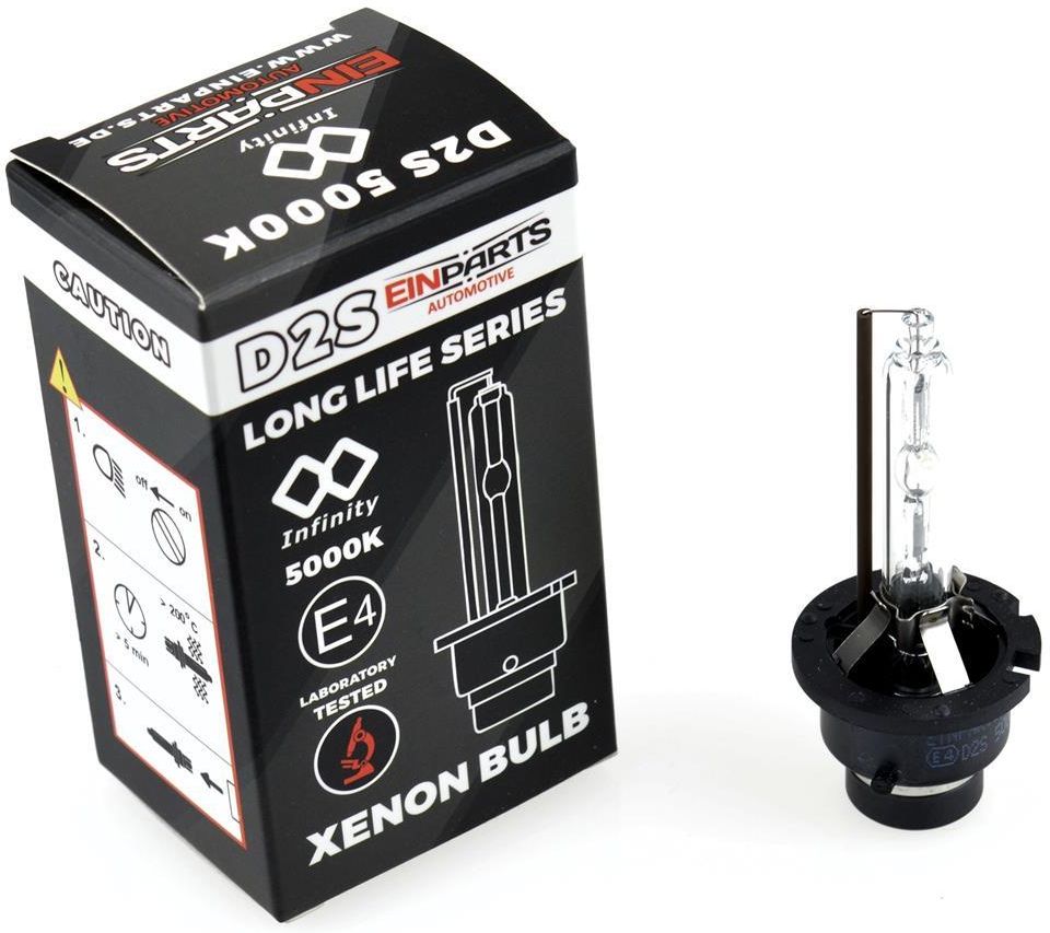 Żarówka EinParts D2S 35W 4800K 85V LongLife, 1 szt. Wysokiej jakości żarówka ksenonowa EinParts Automotive, dostosowana do pracy z każdym urządzeniem, każdą przetwornicą używaną w samochodzie. Posiada europejską homologację ECE E4 i jest w pełni dopuszczona do użytku na drogach publicznych. Żarówka została wykonana w oparciu o zaawansowaną technologię H.I.D (wyładowania wysokiej intensywności). Żarniki XENON zaleca się wymieniać parami, ponieważ pojedyncza wymiana może spowodować zauważalne różnice w równomierności światła, barwie i intensywności. Seria Long Life to Najwyższej jakości mieszanka gazów szlachetnych oraz 100% napełnienie rurki zapewniają bardzo długi okres eksploatacji Żarnik wykonany z najlepszych dostępnych komponentów posiadający metalową konstrukcje Podwójnie hartowane szkło kwarcowe Uniwersalna – współpracuje z każdą przetwornicą Przedłużona gwarancja producenta do 36 miesięcy! Dane techniczne Typ żarówki: D2S Seria: LongLife Rodzaj złącza (trzonek): P32d-2 Barwa światła: 4800K Moc: 35W Napięcie: 85V (odpowiednie zarówno dla samochodów 12V, jak i ciężarówek 24V) Strumień świetlny: 3200LM Homologacja: E4 Zastosowanie: Światła drogowe i mijania, światła pozycyjne przednie Zawartość opakowania: 1 szt.