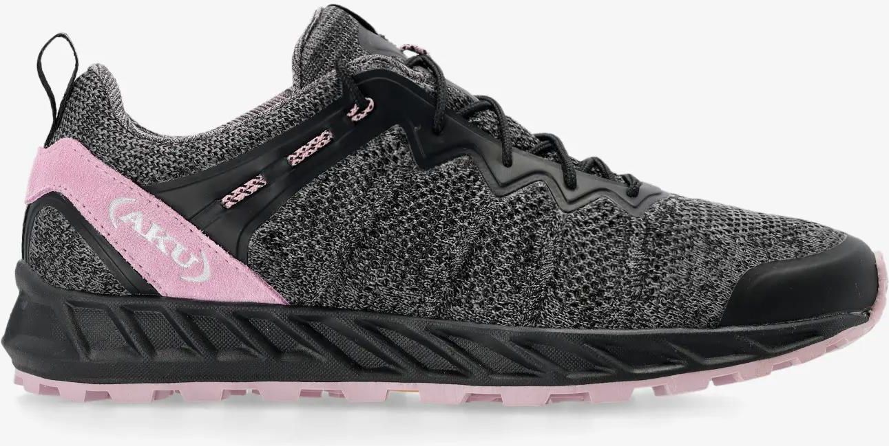 Buty damskie AKU Rapida Air - black/pink to model do użytkowania w cieplejszym okresie w roku, który sprawdzi się zarówno podczas wędrówek, jak i noszenia codziennego. Niska konstrukcja wykorzystuje cholewkę z dzianiny, która zapewnia perfekcyjne dopasowanie do stopy i oferuje ponadprzeciętną przewiewność. Buty damskie AKU Rapida Air - black/pink mają wkładkę Ortholite® Hybrid. Wkładka zapewnia odpowiednie odprowadzanie nadmiaru wilgoci powstającej przy stopie. Wkładki zastosowane w tych butach zostały zaprojektowane częściowo z materiałów z recyklingu. Te niskie buty turystyczne mają śródpodeszwę wykonaną z pianki EVA, co zapewnia odpowiednią amortyzację. Model ma również elastyczną płytkę z materiałów tekstylnych. W tych damskich butach turystycznych AKU zastosowano wysokiej jakości podeszwę opracowaną przez markę Vibram®, o nazwie Vibram® Cruise. Podeszwa zapewnia dobrą przyczepność do podłoża. Model jest przeznaczony na wędrówki turystyczne w bezdeszczową pogodę. Buty AKU Rapida Air - black/pink - najważniejsze cechy:Model z niską cholewką;Cholewka z połączenia oddychającego materiału tekstylnego i zgrzewanej folii PU z przodu;Wewnątrz znajduje się dopasowana wkładka Ortholite® Hybrid;Wkładka uzyskana częściowo z materiałów z recyklingu;Wkładka zapewnia sprawne odprowadzanie wilgoci;Śródpodeszwa z pianki EVA;Elastyczna płytka z materiałów tekstylnych w śródpodeszwie;Podeszwa Vibram® Cruise zapewniająca dobrą przyczepność do podłoża;Model przeznaczony na miasto oraz mniej wymagające trasy.