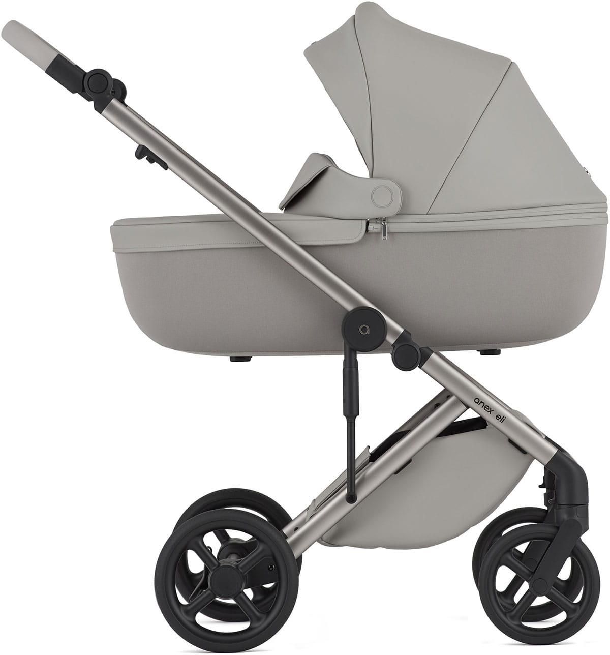 Eli to kolejna perełka w ofercie marki Anex - ten wielofunkcyjny wózek głęboko-spacerowy w zestawie z gondolą i spacerówką zadba o komfort Twojej rodziny od narodzin maluszka do nawet 4 lat. Anex Eli jest wózkiem zaprojektowanym w zgodzie ze sztuką minimalizmu. Tak dobrze znana konstrukcja wózków Anex została podrasowana, dzięki czemu jeszcze głośniej przemawia do młodych rodziców. Wózek Anex Eli jest lżejszy i bardziej kompaktowy, przez co jest symbolem nowoczesności. Dodając do tego super przytulną gondolę i wygodną spacerówkę otrzymujemy rozwiązanie na każdy dzień, na wiele lat. Niezawodny pod względem ergonomii i funkcjonalności, niezwykle majestatyczny - taki właśnie jest wózek wielofunkcyjny Anex Eli. Jeśli przeczesujesz Internet w poszukiwaniu idealnego wózka dla Twojego dziecka, przyjrzyj się bliżej Anex Eli. W zestawie Adaptery do regulacji wysokości; pałąk siedziska spacerowego; osłona przeciwdeszczowa; moskitiera. Cechy charakterystyczne Zmiana wysokości Anex Eli zapewnia ergonomię nie tylko dziecku, ale również rodzicowi. Za pomocą dołączonych adapterów możemy zmienić wysokość gondoli i siedziska spacerowego, przez co spacerując z dzieckiem możemy łatwo zadbać o poprawną postawę. Przytulna gondola Materac Sorona dołączony do gondoli wózka wielofunkcyjnego Anex Eli jest stworzony z najwyższej jakości materiałów oraz w oparciu o nowoczesną technologię. Dzięki temu dobrze chroni malutki kręgosłup, umożliwiając mu zdrowy rozwój, jednocześnie jest miękki, komfortowy i dobrze oddychający. Wnętrze gondoli zachęca do odpoczynku, co z pewnością maluch szybko zauważy. Świadomy dobór materiałów Dzisiejszy świat stawia na zrównoważony rozwój, a idąca z duchem czasu marka Anex wcale się temu nie sprzeciwia. Podczas produkcji wózka Eli udoskonalono proces wyrabiania kół, a znajdujący się w gondoli materiał EPP jest przystosowany do recyklingu. Dzięki temu wspieramy to, co ważne. Dwa kierunki jazdy Siedzisko spacerowe w wózku Anex Eli w niczym nie odstaje od konkurencji. Wysoka funkcjonalność przejawia się między innymi w możliwości przepięcia siedziska i ustawienia go przodem lub tyłem do rodzica. Komfortowe i bezpieczne siedzisko Siedzisko jest przystosowane do długich spacerów. Kiedy dziecko się zmęczy, możesz rozłożyć oparcie i cieszyć się chwilą dla siebie podczas drzemki malucha. Magnetyczna klamra w siedzisku pozwala na szybkie zapięcie pociechy a barierka dodatkowo zabezpieczy go przed wypadkiem. Duża budka siedziska chroni przed słońcem a wbudowany w nią panel wentylacyjny dodatkowo usprawnia przepływ powietrza. Kompaktowa konstrukcja Kompaktowa, lekka konstrukcja wózka posiada amortyzowany stelaż oraz bezobsługowe, nieprzebijalne koła Flexi. Dzięki temu wózek Anex Eli odznacza się płynną, responsywną jazdą, która jest niezależna od typu nawierzchni.