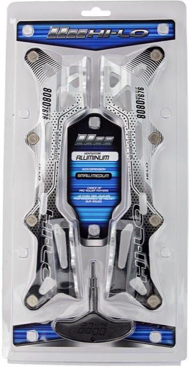 Czarno-srebrna Hi-Lo - jest bardzo mocną i lekką aluminiową szyną/ płozą do hokeja na rolkach z układem kół w dwóch rozmiarach Hi-Lo 76mm / 80mm używanych w rolkach Mission i Bauer. Szyna zapewnia lepszą pozycję na rolkach i większą równowagę. Dostępna w 2 rozmiarach, do rolek Senior, Medium (6.0-9.5) i Large (10.0-12.0). Zestaw zawiera: 2 szyny/płozy. 8 osi. 8 podkładek 608. 1 narzędzie do montażu.