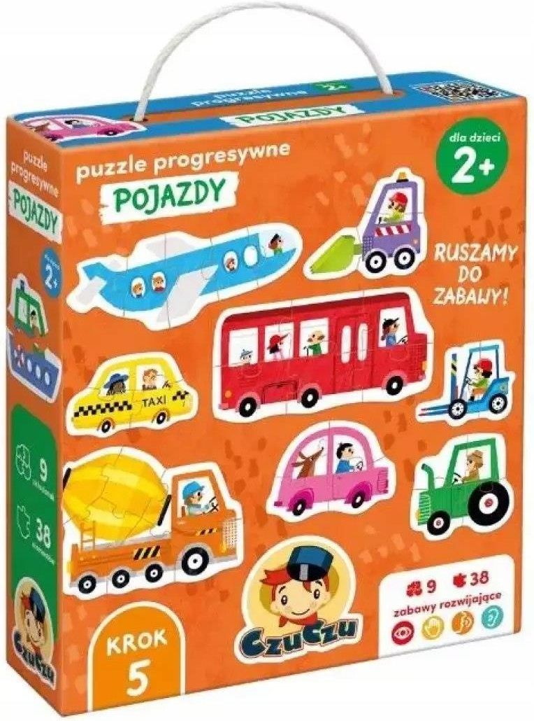 CzuCzu Puzzle Progresywne POJAZDY Układanka Ruszamy do Zabawy Prezent 2+ CzuCzu Puzzle progresywne Pojazdy 2+ Brum, brum! Ruszamy do zabawy! Zestaw CzuCzu Puzzle progresywne Pojazdy to idealny wybór na pierwsze, wieloelementowe układanki dla najmłodszych miłośników aut, samolotów i maszyn. Co znajdziesz w środku 9 układanek o rosnącej liczbie elementów (łącznie 33 elementy) kolorowe ilustracje dopasowane do wieku dziecka duże i trwałe elementy z grubej tektury poręczne pudełko o wymiarach 16,5 × 19 × 5 cm Dlaczego warto? idealne pierwsze puzzle dla dzieci od 2 roku życia wspierają rozwój małej i dużej motoryki uczą spostrzegawczości, cierpliwości i logicznego myślenia zachęcają do rozmów o pojazdach i nowych słowach doskonałe do zabawy w domu i w podróży Dla ciekawych świata maluchów Dwulatek z każdym dniem odkrywa coś nowego – poznaje kolory, kształty, nazwy przedmiotów i dźwięki. Puzzle progresywne CzuCzu pomagają mu rozwijać się przez zabawę – krok po kroku, od prostych układanek po bardziej wymagające obrazki. Zabawka, która uczy przez zabawę i dostarcza mnóstwo radości!