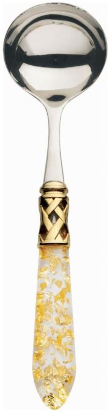 Casa Bugatti ALADDIN GOLD Łyżka do sosów Casa Bugatti ALADDIN GOLD Łyżka do sosów Ta niezwykle oryginalna, nowoczesna i funkcjonalna łyżka do sosów zachwyca nie tylko wyglądem, ale też niezwykłą jakością. Sztućce wykonane są ze stali szlachetnej 18/10 polerowanej i masy akrylowej transparentnej z cząsteczkami złota. Dodatkowo zostały wykończone ozdobnym pozłacanym pierścieniem. Właściwości: Materiał: stal nierdzewna 18/10, akryl, pozłacany pierścień Długość: 21 cm Wykończenie: złota rączka Można myć w zmywarce do 50/55°C, zalecane mycie ręczne