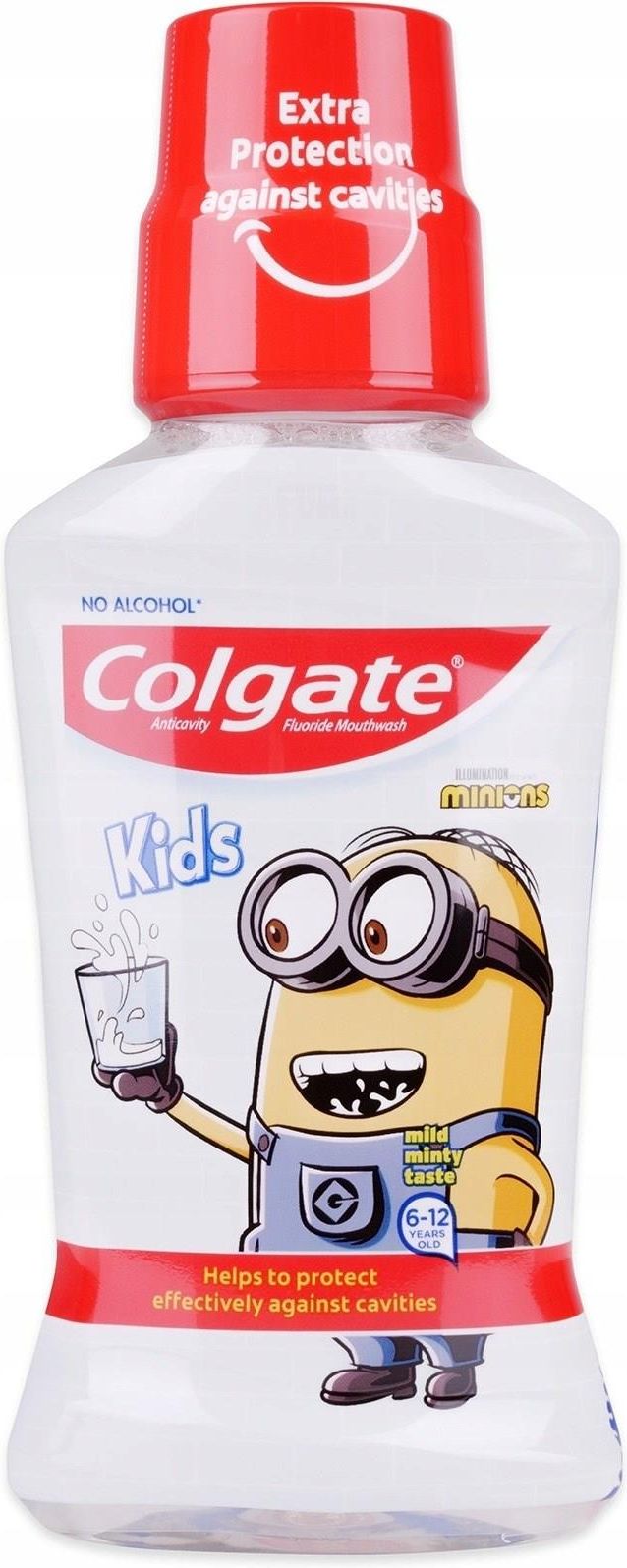 Colgate Płyn do płukania ust minionki 250ml Płyn do płukania jamy ustnej Colgate Kids Minions nie tylko odświeża oddech, ale jednocześnie walczy z osadem nazębnym i pomaga zachować zdrowe dziąsła i zęby. Właściwości: ma wesoły, dziecięcy motyw nie piecze w jamie ustnej do codziennej higieny jamy ustnej niszczy bakterie zapobiega rozwojowi próchnicy zębów zapewnia świeży oddech   Od pierwszego ząbka do pięknego uśmiechu By Twoje dziecko mogło cieszyć się dobrym zdrowiem jamy ustnej należy dbać o higienę i dobre nawyki już od pierwszych miesięcy. Od chwili pojawienia się pierwszych ząbków, mycie zębów przynajmniej dwa razy dziennie przez dwie minuty pastą z fluorem to podstawa. Pozwala zahamować rozwój bakterii odpowiedzialnych za próchnicę oraz wzmacniać delikatne szkliwo małych ząbków dostarczając odpowiednią dawkę fluoru dostosowaną do wieku dziecku. Pamiętaj też, aby odwiedzać z dzieckiem dentystę co 6 miesięcy! Naucz i zachęć dzieci do mycia zębów  Dziecko może zacząć samodzielnie myć zęby, ale przy Twojej pomocy.  Zacznij od szczoteczki z miękkimi włóknami i pasty z fluorem w ilości odpowiadającej wielkości ziarnka grochu, o lubianym przez dzieci owocowym smaku. Gotowi? Start: 1. Szczotkujcie ząbki od lewej do prawej i od góry do dołu, wykonując krótkie, delikatne ruchy.  2. Powtórzcie to samo od wewnątrz. 3. Ząbki należy myć dwa razy dziennie, codziennie przynajmniej przez 2 minuty. Twoją rolą jest dokończenie szczotkowania po tym, jak uczyni to dziecko. Większość małych dzieci potrafi dokładnie czyścić zęby dopiero w wieku około 6 lat.  Wypróbuj też inne produkty Colgate dla dzieci! Dla najlepszej ochrony dziecięcych ząbków przed próchnicą używaj pasty COLGATE KIDS wraz z innymi produktami Colgate dla dzieci.  Produkty dostosowane do wieku dziecka pomogą skutecznie czyścić zęby, usuwać płytkę nazębną oraz zwalczać bakterie, które gromadzą się na zębach, języku, dziąsłach i policzkach. Dla kompletnej ochrony skorzystaj z całego systemu Colgate: ● szczoteczka do zębów ● pasta do zębów ● płyn do płukania jamy ustnej