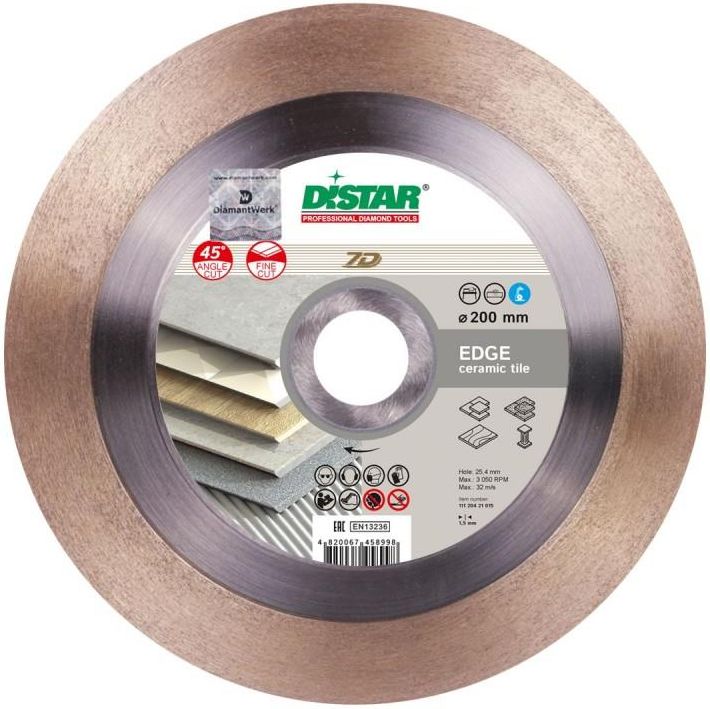 Tarcza diamentowa Distar 1A1R Edge to narzędzie stworzone dla najbardziej wymagających profesjonalnych użytkowników. Zastosowane rozwiązania śmiało wyznaczają kierunek w jakim rozwija się branża tarcz diamentowych. Tarcza Edge zaprojektowana do cięcia prostego oraz pod kątem 45 stopni na maszynach stacjonarnych, ręcznych lub automatycznych z chłodzeniem wodą. Idealnie sprawdzi się w pracy z płytkami ceramicznymi oraz gresowymi wypalanymi jednokrotnie lub dwukrotnie. Distar Edge to tarcza z ciągłym segmentem diamentowym o wysokości 15mm oraz 10 mm nasypu diamentowego. Tarcza ma mocno zagęszczony nasyp ziarna diamentowego o większym rozmiarze w centrum oraz drobne ziarna na brzegu. Większy rozmiar diamentowego ziarna zapewnia precyzyjne cięcie, a drobne ziarno na brzegu doszlifowuje materiał poddany obróbce. Segment ułożono w technologii Sandwichâ, czyli warstwowo. Trzy warstwy ziaren diamentowych pozwalają na jednoczesne cięcie i szlifowanie podczas pracy z materiałem pod kątem 45 stopni. Korpus tarczy został znacząco wzmocniony, co pozwoliło usztywnić dysk i zachować idealnie prostą linię i stabilność podczas cięcia. Grubość krawędzi tnącej to jedynie 1,3 mm, dzięki czemu możliwe jest precyzyjne cięcie materiału z najwyższą jakością krawędzi. Tarcza diamentowa Distar 1A1R 180 mm Edge to idealne rozwiązanie dla profesjonalistów i majsterkowiczów, którzy szukają precyzyjnego narzędzia do cięcia i szlifowania płytek ceramicznych oraz gresu. Dzięki innowacyjnej konstrukcji, tarcza zapewnia wyjątkowe połączenie sztywności i miękkości cięcia, co czyni ją niezastąpioną w pracach wykończeniowych. Tarcza Edge charakteryzuje się szeroką, dwustronną warstwą diamentową, która wzmacnia jej korpus, nadając mu niezwykłą stabilność podczas pracy. Specjalny wzór plastra miodu w diamentowym wiązaniu umożliwia miękkie, ale jednocześnie bardzo wydajne cięcie, co pozwala na precyzyjne prowadzenie tarczy w linii prostej. Dodatkowo, jej konstrukcja pozwala na szlifowanie krawędzi płytek, co jest szczególnie przydatne przy bizotowaniu pod kątem 45°, które jest często wykonywane przy wykańczaniu narożników. Niezależnie od tego, czy pracujesz z ceramiką, czy gresem, tarcza diamentowa Distar 1A1R zapewnia najwyższą jakość wykończenia. Możliwość stosowania tarczy na szlifierkach kątowych bez potrzeby dodatkowego chłodzenia sprawia, że praca jest wygodna i efektywna. Dzięki swojej wysokiej wydajności i trwałości, tarcza Edge jest doskonałym wyborem dla tych, którzy cenią sobie precyzję i profesjonalizm w wykonywaniu swoich projektów. Zastosowanie tej tarczy sprawia, że bizotowanie i inne precyzyjne cięcia stają się prawdziwą przyjemnością. Tarcza diamentowa Distar 1A1R Edge to narzędzie, które powinno znaleźć się w arsenale każdego rzemieślnika, dążącego do perfekcji w swoim fachu. .