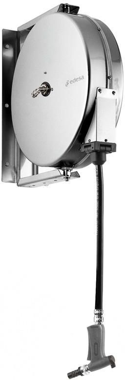 Gama węży ze spryskiwaczem specjalnie zaprojektowana do instalacji w przemyśle przetwórstwa spożywczego (mięso, ryby, warzywa, ...) oraz gastronomii.Opis:Obudowa i uchwyty wykonane w całości ze stali nierdzewnej AISI 304 18/10.Wyposażona w specjalny czarny gumowy wąż, certyfikowany do użytku spożywczego, wytrzymały i odporny na wysokie temperaturySystem bębnowy z chowanym wężem oraz blokadą, która utrzymuje pożądaną długość wężaPodłączenie wody z gwintem zewnętrznym 1/2 “i zaworem zwrotnymRegulowane napięcie sprężyny w środkuUchwyt obrotowy pozwala na duży zasięg pracy do 180 ? w modelu EF-6 oraz do 330 ? w modelach EF-10 i EF-15Regulowany pistolet wykonany z tworzywa o wysokiej wytrzymałości steruje przepływem wody, wyposażony w funkcję pracy ciągłejErgonomiczny, zapewnia komfortowe użytkowaniePosiada jako wyposażenie dodatkowe lancę przedłużającą o 45 cm, montowaną na spryskiwaczu, która zapewnia dojście do miejsc trudno dostępnych i ograniczenie wysiłku ze strony użytkownikaTemperatura pracy przy ciśnieniu 4 bar wynosi 60?C i zaś przy 6 bar wynosi 40°CParametry:Długość: 10000 mmZakres pracy: 165? + 165?
