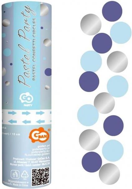 KONFETTI PNEUMATYCZNE KÓŁECZKA 15 CM NIEBIESKIE GRANATOWE SREBRNE Stwórz niezapomnianą atmosferę każdej imprezy dzięki pneumatycznej tubie z konfetti w kształcie kółeczek. Produkt z kolekcji Pastel Party marki Godan zawiera konfetti w modnych odcieniach: niebieskim, granatowym i srebrnym. Tuba o długości 15 cm nie zawiera ładunków pirotechnicznych – konfetti wyrzucane jest za pomocą sprężonego powietrza, co czyni je bezpiecznym i efektownym dodatkiem do każdej uroczystości. Najważniejsze cechy produktu - Pneumatyczny mechanizm – bezpieczny wyrzut przy użyciu sprężonego powietrza - Efektowne konfetti – foliowe kółeczka w kolorach: niebieski, granatowy, srebrny - Łatwa obsługa – wystarczy przekręcić tubę, by rozpocząć wystrzał - Idealne na każdą okazję – urodziny, baby shower, sylwester, przyjęcia tematyczne - Bez pirotechniki – produkt bezpieczny w użyciu przez osoby dorosłe Zastosowanie Konfetti pneumatyczne to doskonały wybór na wszelkiego rodzaju imprezy okolicznościowe. Świetnie sprawdzi się podczas kulminacyjnych momentów – składania życzeń, wręczania prezentów, toastów czy w trakcie zdjęć grupowych. To także bezpieczna i widowiskowa alternatywa dla fajerwerków. Informacje techniczne - Wzór: kółeczka - Kolory: niebieski, granatowy, srebrny - Materiał konfetti: folia - Długość tuby: 15 cm - Mechanizm: pneumatyczny (sprężone powietrze) - Liczba sztuk w opakowaniu: 1 - Producent: Godan S.A. - Kolekcja: Pastel Party - Przeznaczenie: tylko dla osób dorosłych