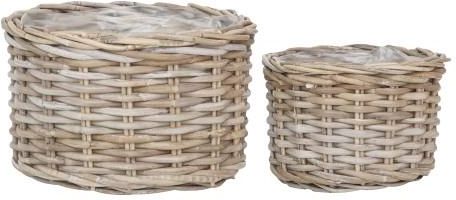 ZESTAW KOSZY DEKORACYJNYCH KALAK RATTAN - 2 sztuki. Kalak kosze dekoracyjne - 2 kosze różnych wielkości plecione z rattanu, z plastikową folią w środku Zestaw stanowią 2 sztuki. U duńskiego producenta HOUSE NORDIC występuje dużo rodzajów plecionych koszy czy doniczek o różnych o kształtach, kolorach i wymiarach - patrz produkty powiązane. 2 kosze różnych wielkości plecione z rattanu, z plastikową folią w środku