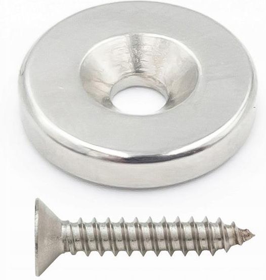 MAGNES NEODYMOWY 15x3MM WALCOWY POD WKRĘT KLASY N45 MARKI HUNTER PARAMETRY MAGNESU: ✅ WYMIARY: 15 mm [średnica] x 3 mm [wysokość] ✅ WYMIARY OTWORU: 7 mm [jedna strona] 3,5mm [druga strona] ✅ UDŹWIG: ~ 3,14 kg (na udźwig wpływa wiele czynników, sugerujemy przetestować magnes w danych warunkach) ✅ WAGA / SZT: 3,5 g ✅ TYP: PIERŚCIENIOWY [POD WKRĘT] ✅ KLASA: N45 [jedna z najwyższych klas przyciągania] ✅ POWŁOKA MAGNESU: NiCuNi [antykorozyjna] ✅ TRWAŁOŚĆ MAGNETYCZNA: Oferujemy wyłącznie produkty najwyższej jakości, gwarantujemy dożywotnią trwałość magnetyczną. ✅ KIERUNEK NAMAGNESOWANIA: Osiowy UWAGA❗ Jeżeli jest potrzeba łączenia ze sobą magnesów parami po ich przykręceniu należy koniecznie napisać w wiadomości przy zakupie: "przeciwne bieguny". Przy łączeniu magnesów z powierzchnią metalową nie ma to znaczenia - zawsze będą się przyciągały. Magnes neodymowy 15x3mm walcowy pod wkręt klasy N45 z otworem to idealny wybór dla zastosowań, w których wymagana jest wysoka siła przyciągania (ok. 3,14kg) przy niewielkich rozmiarach. Wykonany z neodymu, żelaza i boru (NdFeB) walcowy magnes wyróżnia się wyjątkową wytrzymałością i trwałością, dzięki czemu sprawdza się w wielu rozwiązaniach. Otwór umożliwia mocowanie magnesu do różnych powierzchni, nie tylko ferromagnetycznych. Magnes neodymowy 15x3mm walcowy pod wkręt - parametry techniczne Magnes klasy N45 o sile przyciągania rzędu 3,14kg oferuje wyjątkową wydajność w stosunku do swojego rozmiaru. Powłoka Ni-Cu-Ni nie tylko zabezpiecza go przed korozją, ale również wzmacnia trwałość, szczególnie w wilgotnym środowisku lub przy długotrwałym użytkowaniu. Osiowe namagnesowanie gwarantuje, że siła przyciągania działa w pionie, co okazuje się istotne w aplikacjach, gdzie magnes jest mocowany na płaskiej powierzchni. Fazowany otwór montażowy Magnes neodymowy 15x3mm walcowy pod wkręt posiada otwór montażowy o specjalnej, stożkowej konstrukcji. Jego średnica zaczyna się od 7mm, stopniowo zwężając się do 3,5mm, co zapewnia doskonałe dopasowanie dla załączonego wkrętu o rozmiarze 3x16mm. Dzięki temu po zamocowaniu główka wkrętu jest schowana, poprawiając estetykę i bezpieczeństwo montażu przy jednoczesnej stabilności mocowania. Klasy magnesów neodymowych Magnesy neodymowe są podzielone na różne klasy, które definiują ich siłę magnetyczną. Klasa magnesu oznaczana jest przez literę „N”, a liczba wskazuje maksymalną wartość energii magnetycznej wyrażoną w megagauss oersteds (MGOe). Klasa N45, do której należy nasz magnes, to jedna z wyższych dostępnych na rynku, oferująca bardzo silny strumień magnetyczny. Magnes neodymowy 15x3mm walcowy pod wkręt - osiowe namagnesowanie Magnes neodymowy 15x3mm walcowy pod wkręt posiada osiowe namagnesowanie, co oznacza, że bieguny północny i południowy znajdują się na płaskich powierzchniach magnesu. Ten rodzaj namagnesowania jest szczególnie przydatny w montażu, gdzie istotna okazuje się siła przyciągania działająca w pionie. Dzięki temu magnes idealnie nadaje się do mocowania elementów na płaskich powierzchniach. Magnes neodymowy 15x3mm walcowy pod wkręt - zastosowania Magnesy tego typu znajdują szerokie zastosowanie w wielu branżach i rozwiązaniach, zarówno przemysłowych, jak i amatorskich. Oto kilka przykładów: Mocowanie elementów metalowych – magnesy neodymowe są idealne do stabilnego montażu półek, tablic czy narzędzi. Zastosowania dekoracyjne – magnesy często używa się do mocowania obrazów czy ozdób. Elementy meblowe – stosowane są jako zamki magnetyczne w szafkach i szufladach. Przemysł – magnesy neodymowe wykorzystuje się do stabilizacji komponentów podczas procesów produkcyjnych zwłaszcza tam, gdzie wymagana jest wysoka precyzja mocowania. Dzięki swoim parametrom, możliwości użycia wkrętu i wysokiej sile przyciągania, magnes neodymowy 15x3mm walcowy pod wkręt jest wszechstronnym elementem montażowym, znajdującym zastosowanie w wielu dziedzinach. Uwagi dodatkowe Magnesy powinny pracować w temperaturach poniżej 80 st. C, aby uniknąć utraty swoich właściwości magnetycznych. Magnesy neodymowe generują bardzo silne pole magnetyczne, może ono mieć niekorzystny wpływ na urządzenia elektryczne, elektroniczne czy nośniki pamięci. Mogą również zakłócić pracę rozruszników serca. Mimo swojej znacznej mocy, magnesy neodymowe są kruche, co oznacza, że mogą ulec uszkodzeniu, jeśli nie używana się ich ostrożnie. Zaleca się, aby unikać uderzeń, upuszczania oraz nadmiernego nacisku, które mogą prowadzić do ich pęknięcia. WSKAZÓWKI DOTYCZĄCE STOSOWANIA MAGNESÓW NEODYMOWYCH Unikać ściskania i uderzeń. Magnesy rozdzielać przez zsuwanie, a nie odrywanie. Nie stosować w temperaturze powyżej 80 st. C. Pole magnetyczne może mieć niekorzystny wpływ na urządzenia elektryczne, elektroniczne i nośniki pamięci, a także zakłócać pracę rozruszników serca.
