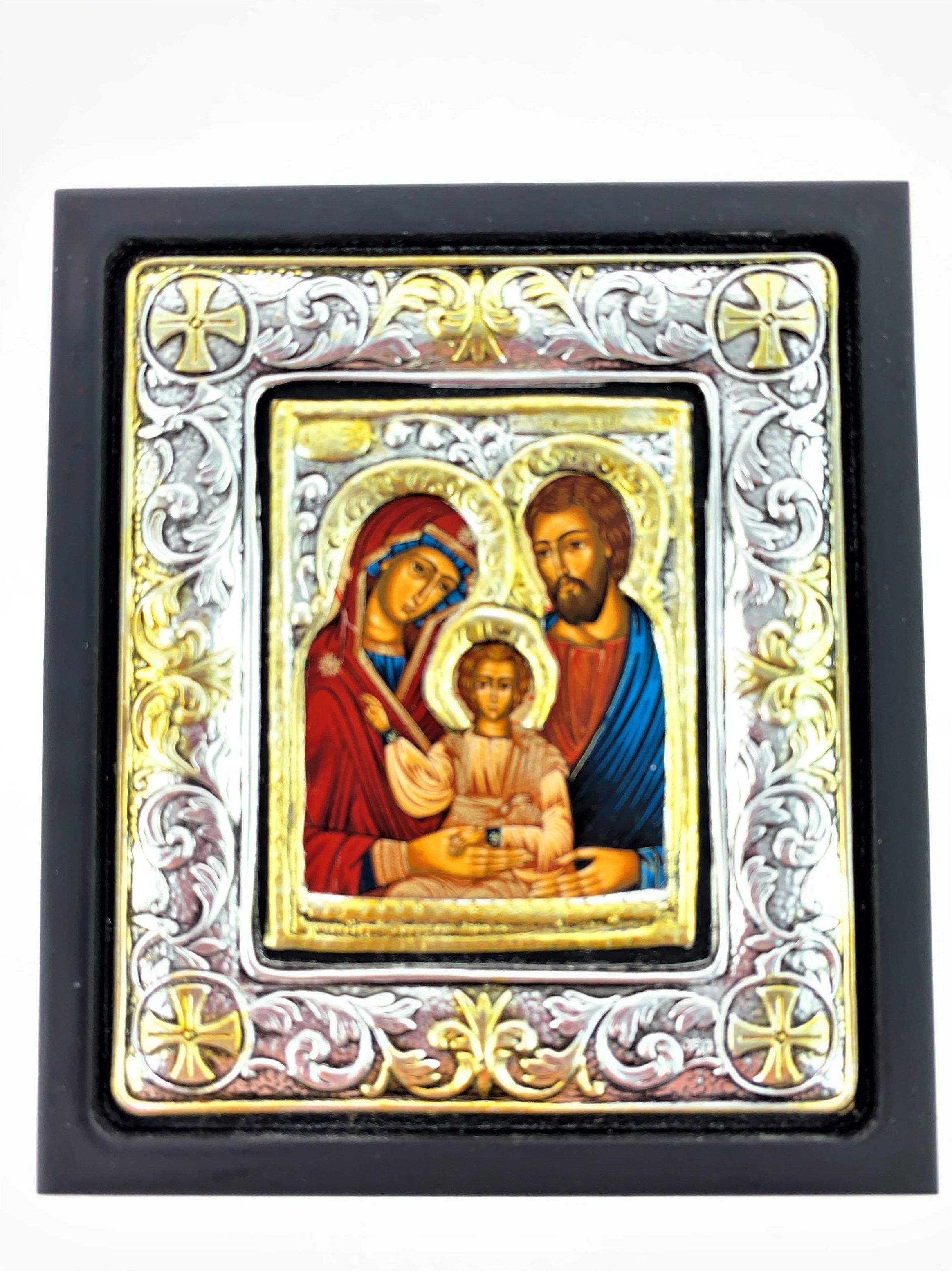 Ikona grecka na desce, w etui Rękodzieło prosto z Grecji. Koszulka metalowa została posrebrzona srebrem próby 925. Wspaniała pomysł na prezent urodzinowy lub pamiątkę I Komunii św. Ikona posiada stosowny certyfikat. Wymiary ikony: 10 x 11,5 cm