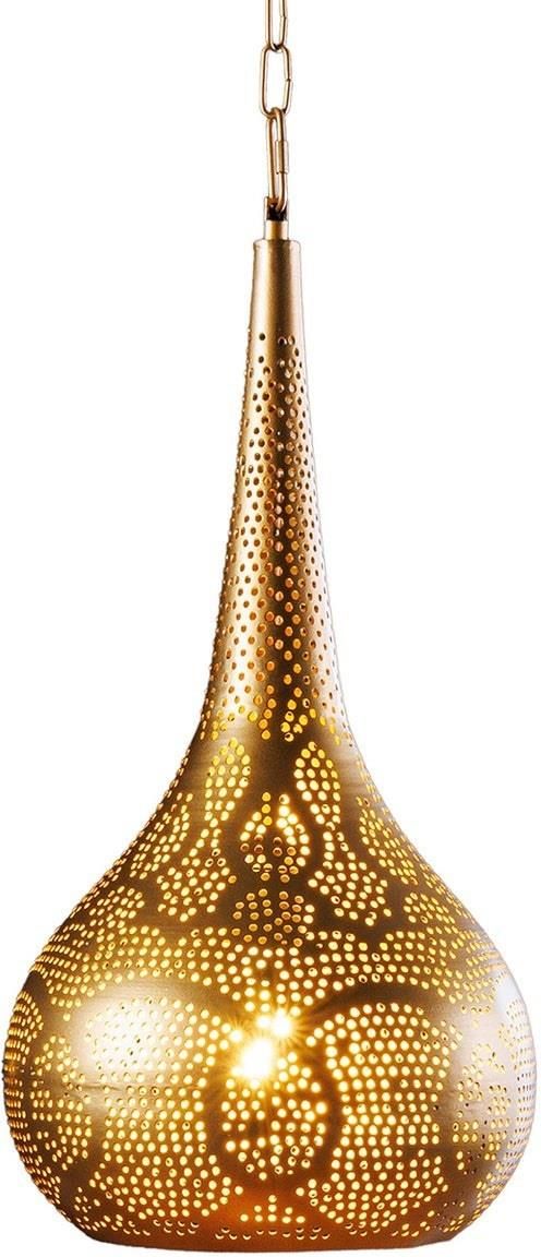 LAMPA WISZĄCA ORIENT LIVING 25 CM ZŁOTA ORIENT LIVING to lampa, która wprowadza do wnętrza ciepło, tajemniczość i orientalny urok. Wykonana ręcznie z dziurkowanego metalu, zachwyca swoim złotym wykończeniem zarówno wewnątrz, jak i na zewnątrz. Jej zdobiona powierzchnia po zapaleniu przez jej drobne otwory delikatnie rozprasza światło równomiernie po całym pomieszczeniu, tworząc na suficie i ścianach fascynujące wzory, nadające przestrzeni wyjątkowego charakteru jednocześnie tworząc wspaniały efekt wizualny. To nie tylko źródło światła, ale także wyrazisty element dekoracyjny, który podkreśli charakter salonu, sypialni czy przedpokoju. Ciepłe, złote światło wprowadza przytulną atmosferę, a orientalny design dodając wnętrzu unikalnego stylu. Złoty łańcuch dodaje jej charakteru i umożliwia łatwe zawieszenie lampy w dowolnym miejscu pomieszczenia. Lampa ORIENT LIVING to nie tylko źródło światła, ale przede wszystkim ozdobny akcent, który przyciąga wzrok i dodaje wnętrzu unikalnego charakteru. W serii ORIENT LIVING występują lampy, wazony, lustra, doniczki oraz stoliki kawowe w różnych kolorach i rozmiarach - patrz produkty powiązane. Pojedyncze sztuki lamp mogą się między sobą różnić np. odcieniem czy wielkością oczek. Wszystkie przetarcia na metalowych elementach, drobne szczeliny oraz ewentualne nierówności są zamierzone. Każdy produkt jest przez to unikalny i oryginalny. Lampa sprzedawana bez żarówki. Zachęcamy do zapoznania się z naszą ofertą ozdobnych żarówek LED. Kliknij tutaj i sprawdź. Invicta Interior to niezawodny dostawca ekskluzywnych designerskich mebli i akcesoriów domowych. Jest to dynamiczna i doświadczona firma z wieloletnimi międzynarodowymi kontaktami i stale poszukującą nowych produktów i innowacyjnych pomysłów. Dojrzała ogólna koncepcja firmy pozwala zaoferować klientom duży wybór nowoczesnych i klasycznych mebli o wyjątkowej jakości w rozsądnych cenach. Invicta Interior monitoruje wszystkie aktualne trendy w branży meblowej, dlatego klienci zawsze otrzymują najnowsze i najwyższej jakości designerskie meble.