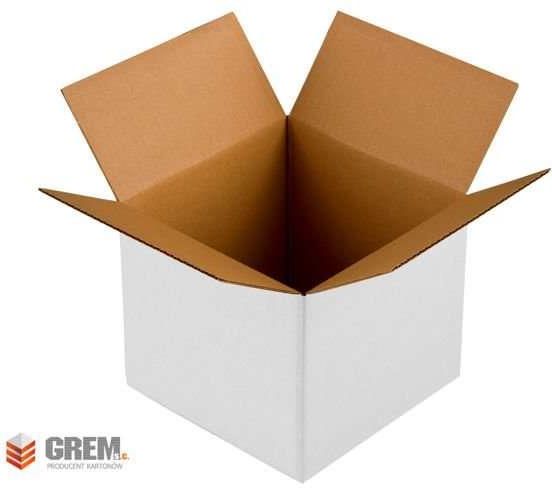 Komplet 10 szt. białych pudeł kartonowych klapowych o wymiarach zew. 400x400x400 mm (dł/szer/wys). Opakowania wykonane są z trzywarstwowej tektury falistej (fala B) o gramaturze 410 g/m2.