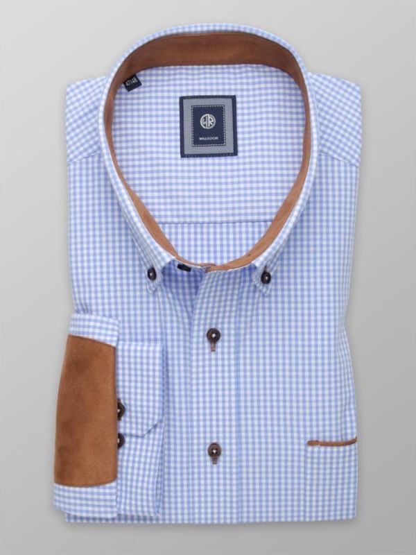 Klasyczna koszula w błękitno-białą kratkę gingham z podpinanym kołnierzykiem, brązowymi kontrastami i nałokietnikami, formuła Easy Care