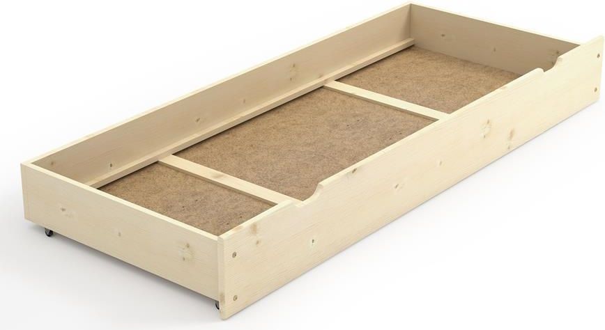 SZUFLADA / ŁÓŻKO z funkcją spania 80x190 Na naszej stronie mamy kilka rodzajów szuflad i pojemników na pościel pod łóżko. Stworzyliśmy wiele rozwiązań, aby można było najbardziej optymalnie skonfigurować zestaw do sypialni. SZUFLADA / ŁÓŻKO ma niecałe 200 cm długości (front), ale długość materaca jaki się mieści w skrzyni to 190 cm. Jest uniwersalna do standardowego łóżka świerkowego o długości 200 cm. Trzeba pamiętać, że nie jest ona przeznaczona do wszystkich szerokości łóżek, o tym jednak w dalszej części opisu. Szuflada jest na całą długość łóżka, więc ustawienie np. szafki nocnej uniemożliwi jej wysunięcie. Aby można było ustawić szafkę nocną obok łóżka i jednocześnie nie ograniczać wysuwanie szuflady, można zastosować szufladę ale mniejszą na 150 lub 100 cm. Takie modele są dostępne w naszym sklepie. Mniejsze pojemniki nie posiadają funkcji spania, ma ją tylko ten produkt. Szuflada jest bardzo pojemna. Aby mogła wytrzymać większe obciążenie i nie szurała dnem po podłodze, zastosowaliśmy dwie listwy wzmacniające dno szuflady. Szuflada stoi na czterech kółeczkach (szuflada jako pojemnik na przechowywanie rzeczy) lub na dwóch kółkach i dwóch klockach (szuflada z funkcją spania, klocki zapobiegają jeżdżeniu pojemnika podczas snu). Produkt jest całkowicie niezależnym elementem łóżka. Konstrukcja wykonana w 100% z drewna, dokładniej z klejonki świerkowej. Klejone drewno zapobiega pękaniu i odkształceniom drewna na szerszych płaszczyznach. Dno wykonane z płyty pilśniowej.Na życzenie klienta, możemy przygotować ofertę na szufladę z dnem ze sklejki brzozowej/bukowej.W zestawie produktu jest stelaż listwowy rolowany[20-L]. SZUFLADĘ / ŁÓŻKO 80x190 można zastosować prawie we wszystkich łóżkach świerkowych dostępnych na naszej stronie sklepu internetowego.Poniżej lista produktów, w których można umieścić SZUFLADĘ / ŁÓŻKO: *Łóżko ALEKS, *Łóżko BARNI, *Łóżko KAJA, *Łóżko KRIS, *Łóżko KUBA, *Łóżko MEGI. Ze względu na niewielkie różnice budowy łóżek w poszczególnych szerokościach, poniżej wypisane są możliwe ilości szuflad w jednym łóżku: *w rozmiarach 80, 90 i 100 cm – 1 szt., *w rozmiarze 120 cm – brak możliwości zastosowania, *w rozmiarach 160, 180 i 200 cm – 1 lub 2 szt. Zalety: Szuflada może spełniać dwie funkcje: pojemnik na pościel lub łóżko wysuwane Korpus i front produktu wykonany z drewna świerkowego, jest w 100% produktem naturalnym! Trwała konstrukcja i solidne przekroje poprzeczne elementów. Wzmocnione dno szuflady. Zaokrąglone krawędzie chroniące przed urazami! Konstrukcja skręcana za pomocą wkrętów i śrub. Łatwy montaż i czytelna instrukcja. Do malowania elementów drewnianych używamy lakierów i farb wodnych! Na każde powłoki zabezpieczające, czy to lakiery, bejce czy farby kryjące (biały i szary) posiadamy odpowiednie certyfikaty, które spełniają normy EN 71:3. Tak aby nasze produkty były bezpieczne, przede wszystkim dla dzieci. Lakiery spełniają tak bardzo rygorystyczne normy bezpieczeństwa, że mogą być stosowane nawet w zabawkach dla najmłodszych! W skład szuflady wchodzi: korpus i front z klejonki świerkowej płyta pilśniowa (dno) zestaw akcesoriów (takich jak: śruby, wkręty, kluczyk i inne…) do skręcenia szuflady 1x stelaż listwowy rolowany SZUFLADA / ŁÓŻKO 80x190 [szerokość x głębokość x wysokość] Wymiary zewnętrzne całkowite: 199,5 x 84,0 x 25,0 Wymiary zewnętrzne korpusu bez frontu: 194,5 x 82,0 x 21,0 Wymiary wewnętrzny korpusu: 190,0 x 80,0 x 18,0