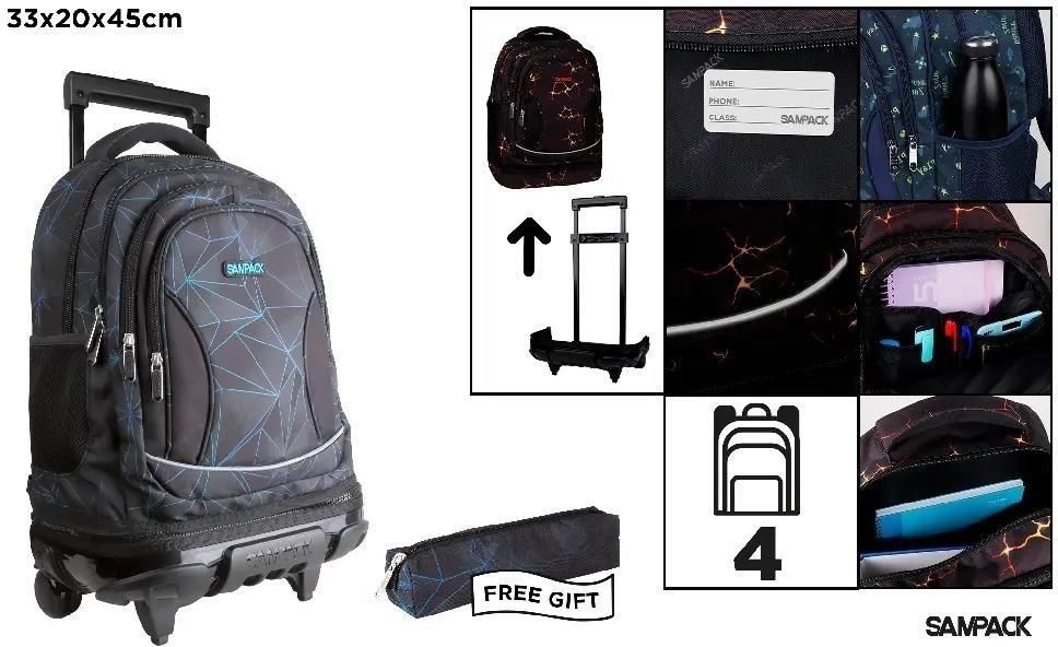 Plecak ze stelażem i kółkami czarny geometryczny czterokomorowy 33x20x45cm, piórnik w zestawie