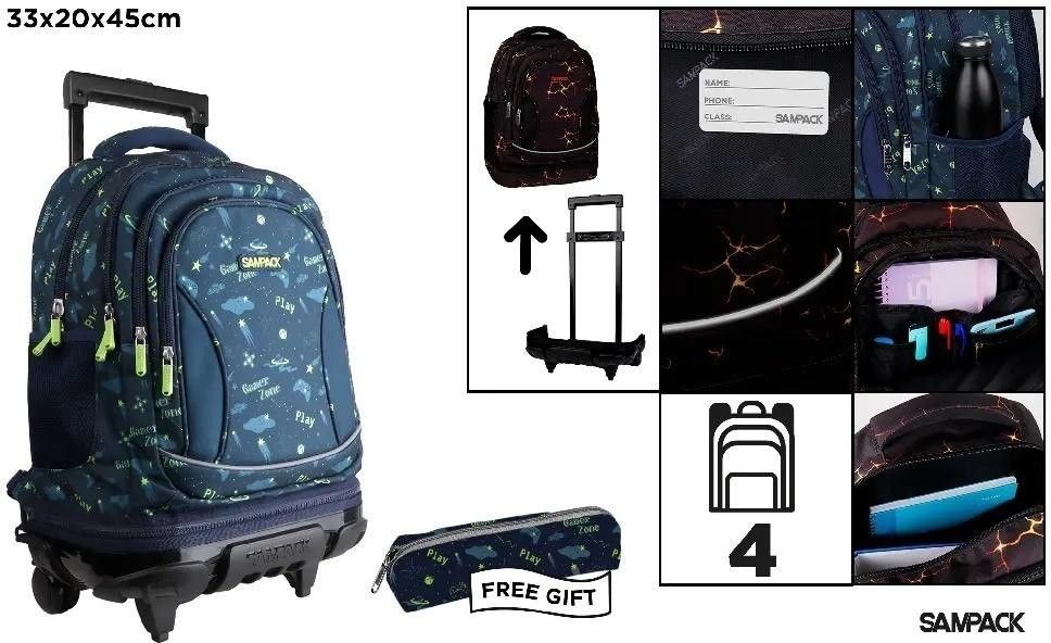 Plecak ze stelażem i kółkami granatowy play czterokomorowy 33x20x45cm, piórnik w zestawie EAN: 8435721032559