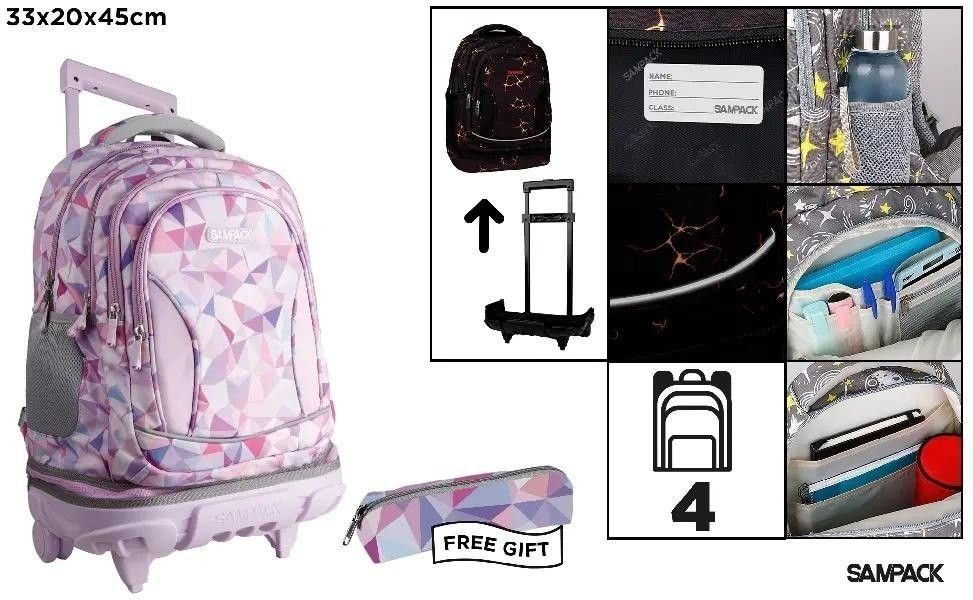 Plecak ze stelażem i kółkami lawendowy geometryczny czterokomorowy 33x20x45cm, piórnik w zestawie EAN: 8435721032535
