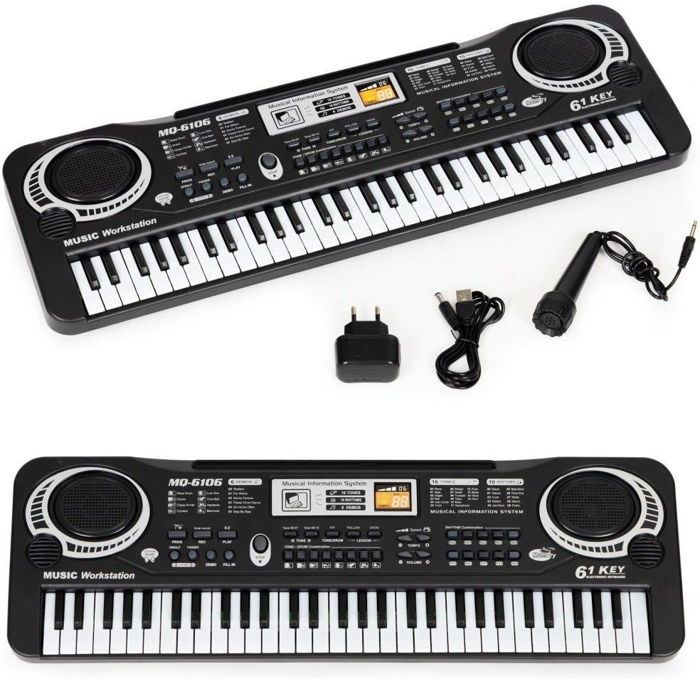 KEYBOARD DLA DZIECI Z MIKROFONEM I ZASILACZEM - 61 KLAVISZY, RÓŻNE RYTMY MULTISTORE KEYBOARD Z MIKROFONEM Dla dzieci powyżej 3 roku życia Rozwija kreatywność i pasję do muzyki 61 klawiszy 2 tryby nauki Możliwość nagrywania 8 dźwięków perkusyjnych 10 różnych rytmów ( disco, funk, polka itp. ) 16 różnych tonacji 6 zaprogramowanych melodii Wielofunkcyjny i nowoczesny design Zapewnia wspaniałą zabawę i rozwija artystyczne zdolności Przenośny i lekki Mikrofon w zestawie Zasilanie: zasilacz lub baterie ( 6 x 1,5 AA ) ROZWIJA ZDOLNOŚCI MUZYCZNE Keyboard z mikrofonem, to doskonały sposób na rozwijanie talentów i tworzenie własnych muzycznych opowieści. Ten interaktywny instrument oferuje nie tylko ciekawe brzmienia, ale także daje dzieciom możliwość wyrażenia się poprzez śpiew. Ten model posiada szereg funkcji, które sprawią, że każda muzyczna zabawa stanie się fascynującym doświadczeniem. To nie tylko instrument, ale prawdziwy środek wyrazu artystycznego. WIELE FUNKCJI Zaprogramowane podkłady muzyczne stanowią wielką inspirację dla młodych kompozytorów. Dzieci mogą eksperymentować z różnymi stylami muzycznymi, tworząc swoje utwory, a następnie dzięki dołączonemu do kompletu mikrofonowi mogą dodawać do nich wokalne akcenty. Każda melodia stanie się dziecięcym dziełem sztuki, a zabawa w komponowanie nie będzie miała końca. Dodatkowe informacje 61 klawiszy 6 piosenek demo 16 tonów 10 rytmów 8 przycisków perkusyjnych Efekty dźwiękowe Tryb lekcji Funkcja nagrywania i odtwarzania Kontrola głośności i tempa MIKROFON Mikrofon został zaprojektowany z myślą o najmłodszych artystach, jest lekki, łatwy w obsłudze i doskonale współpracuje z keyboardem. Dzięki niemu dzieci mogą w pełni wyrazić swoje emocje i połączyć melodię z własnym głosem. ZESTAW ZAWIERA Keyboard Zasilacz + kabel USB Mikrofon z kablem Oryginalne opakowanie SPECYFIKACJA Dla dzieci: + 3 lata Wymiary: 54 x 17,5 x 6,5 cm Regulacja głośności 2 Tryby lekcji Mikrofon w zestawie Ilość klawiszy: 61 Ilość klawiszy funkcyjnych: 35 Długość: 17.50 Szerokość: 5.50 Wysokość: 54.50 Waga: 0.8