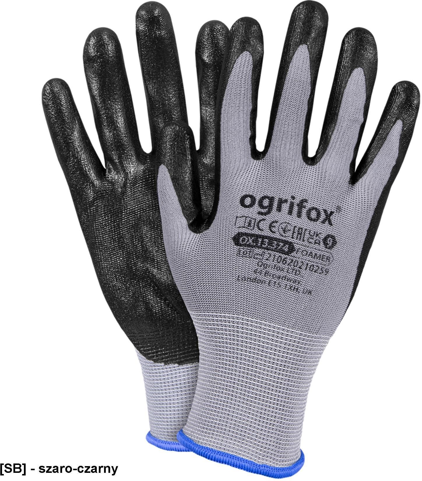 Minimalna ilość zamówienia to opakowanie zawierające 120 par (sprzedaż tylko w pełnch opakowaniach).Cena podana jest za parę rękawic. OX-FOAMER Rękawice ochronne, powlekane nitrylem. wykonane z poliestru (ścieg 13). Zakończone ściągaczem. Powlekane nitrylem typu FOAM w kolorze czarnym. Wykazują bardzo dużą elastyczność oraz świetnie dopasowują się do dłoni. Zapewniają manualność oraz doskonałe czucie trzymanego przedmiotu. Nitryl zwiększa odporność na smary i oleje. Wykorzystywane do ogólnych prac mechanicznych. Marka: OGRIFOX