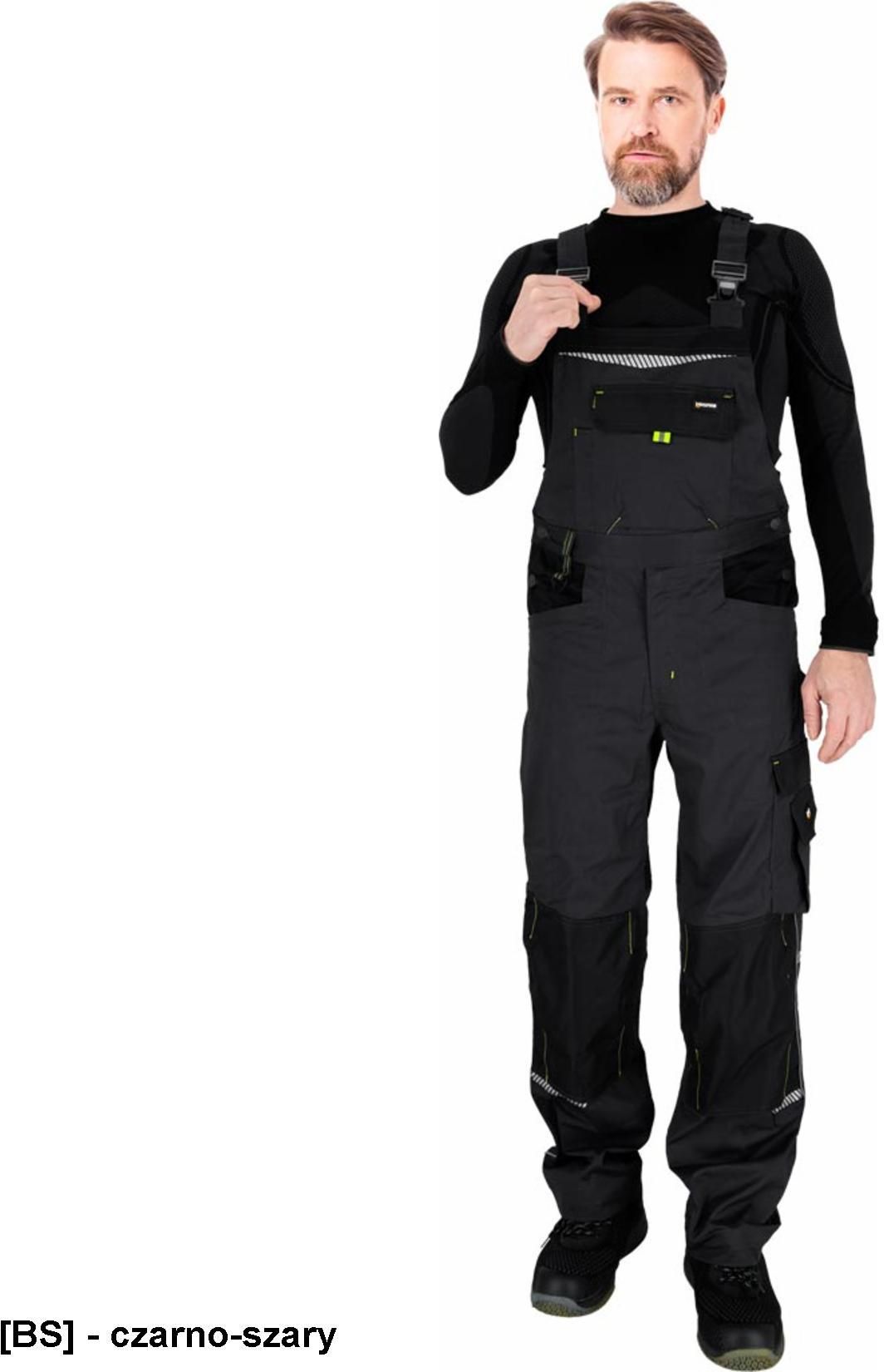 LH-TAURUS-B Spodnie ochronne ogrodniczki, męskie. materiał główny: tkanina o splocie twill 62% bawełna, 35% poliester, 3% elastan o gramaturze 260 g/m2. Wstawki na kolanach: tkanina 100% poliester Oxford 600D o gramaturze 230 g/m2. Zapinane na zamek błyskawiczny zasłonięty patką. Kieszeń na klatce piersiowej zapinana na suwak oraz rzep z dodatkową wąską kieszonką na przybory np. długopis. Dwie kieszenie boczne oraz dwie tylne, w tym jedna zapinana na rzep. Kieszenie na nogawkach, w tym jedna podwójna zapinana na rzep oraz jedna podłużna z przegródkami. Kieszenie na wkładki nakolannikowe wkładane od dołu. Wyprofilowane kolana. Możliwość regulacji długości za pomocą szelek, które dodatkowo mają w tylnej partii gumkę. Gumka w pasie w tylnej partii oraz guziki umożliwiające lepsze dopasowanie. Końcówka do przypięcia kluczy. Uchwyt na młotek na lewej nogawce. Odblaskowe elementy. Fason: REGULAR. Marka: L.HOLLMAN