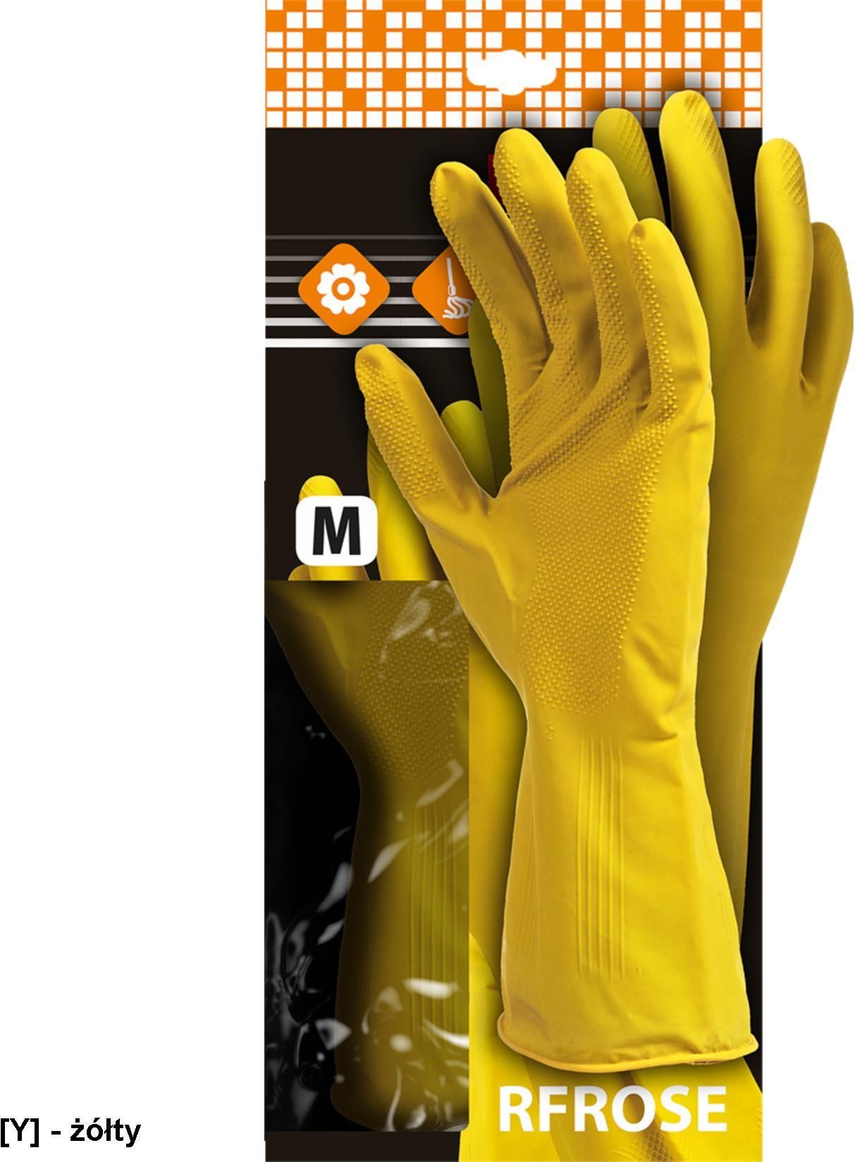 Rękawice Ochronne Gumowe RFROSE Y Flokowane wewnątrz Szorstka część chwytna Żółte Rozmiar M Rękawice ochronne gumowe flokowane. 100% kauczuk naturalny wewnętrzna powierzchnia pokryta flokiem (pyłem bawełnianym), co ułatwia wkładanie i zdejmowanie rękawic oraz zapobiega poceniu się rąk w czasie użytkowania na części chwytnej chropowata struktura dzięki czemu rękawiczki zyskują lepszą przyczepność grubość części chwytnej: 0,46 mm odporne na rozciąganie wysoka odporność na detergenty i środki piorące doskonale sprawdzą się w gospodarstwach domowych wykorzystywane do ogólnych prac mechanicznych każda para pakowana w osobną torebkę, dzięki czemu świetnie się prezentują i są idealne na wszelkiego rodzaju prezentacje potocznie zwane jako floki lub rękawice gospodarcze zgodne z normą EN420 rozmiary: S - XL