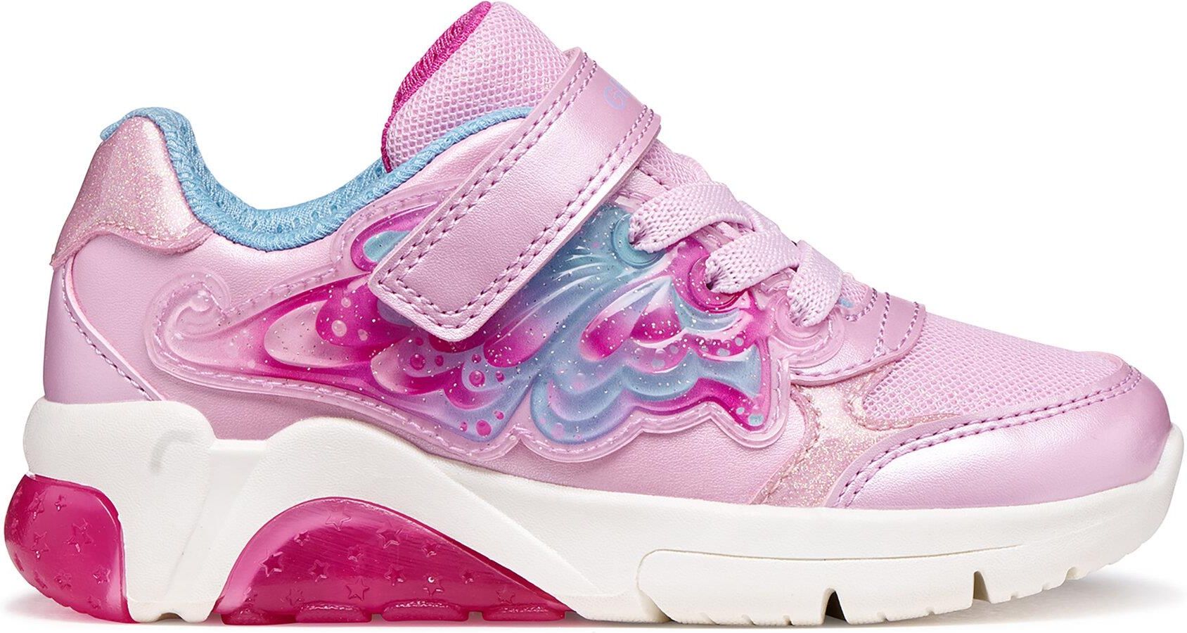 Sneakersy dziewczęce Geox to wyjątkowe obuwie, które łączy styl i funkcjonalność, idealne dla małych miłośniczek mody! Dzięki zapięciu na rzep zakładanie i zdejmowanie butów jest szybkie i wygodne, a gumowy klin w cholewce zapewnia dodatkowy komfort i elastyczność podczas noszenia. Technologia Geox Respira dba o odpowiednią cyrkulację powietrza, gwarantując świeżość nawet po całym dniu pełnym aktywności. Efektowne migające diody dodają butom niepowtarzalnego charakteru i sprawiają, że każda mała dama poczuje się wyjątkowo. Idealne na co dzień i nie tylko!