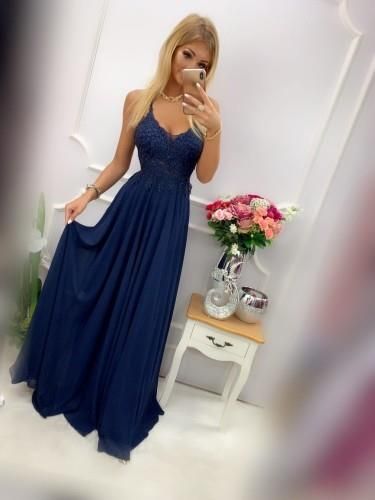 Elegancka, długa sukienka w oryginalnym kroju. Góra sukienki ozdobiona jest piękną koronką oraz mieniącymi się kryształkami. Sukienka ma pięknie odkryte plecy, z przodu posiada wszyte miseczki ,dzięki czemu nie trzeba zakładać biustonosza. Dół sukienki wykonany jest z eleganckiej lejącej tkaniny oraz lejącej podszewki. Kreacja idealnie sprawdzi się na wesele dla gościa lub dla druhny a także na inne okazje. Sukienka szyta w rozmiarach od 34 - 38 Przy braku potrzebnego rozmiaru prosimy o kontakt W razie braku poszukiwanego rozmiaru prosimy o kontakt Tabela wymiarów danego modelu sukienki (wymiary podane w centymetrach) rozmiar biust pas 34 82-88 64-68 36 84-90 68-72 38 88-94 70-74 Ponieważ sukienki szyte są na dwu szwalniach bardzo prosimy przed zakupem o kontakt telefoniczny lub mailowy z podaniem swoich wymiarów. W ten sposób dużo łatwiej i bezpieczniej będzie dobrać odpowiedni rozmiar lub odpowiednią sztukę ze względu na delikatne różnice w wymiarach. Lepiej dobrze ustalić niż wymieniać :)