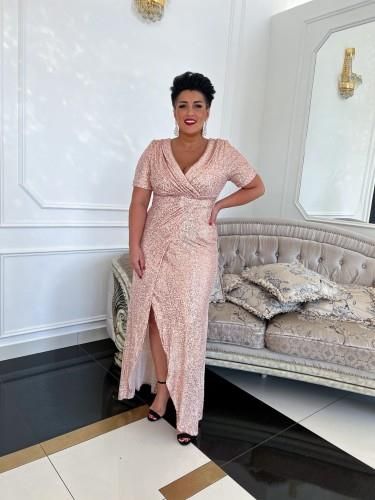 Zjawiskowa długa sukienka z krótkim rękawkiem uszyta z rozciągliwego materiału udekorowana w całości cekinami. Sukienka idealnie dopasowuje się do ciała . Piękny wycięty dekolt ozdobiony kołnierzykiem. Wszyte miseczki pozwalają na nie zakładanie biustonosza. W pasie fikuśne marszczenia idealnie …