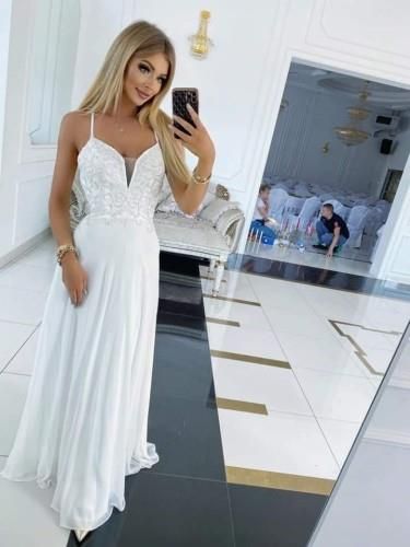 Elegancka, długa sukienka w oryginalnym kroju. Góra sukienki ozdobiona jest piękną koronką oraz mieniącymi się kryształkami. Sukienka ma pięknie odkryte plecy, z przodu posiada wszyte miseczki, dzięki czemu nie trzeba zakładać biustonosza. Dół sukienki wykonany jest z eleganckiej lejącej tkaniny oraz lejącej podszewki. Kreacja idealnie sprawdzi się na wesele Sukienka szyta w rozmiarach od 34 - 38 Jeżeli nie ma potrzebnego rozmiaru prosimy o kontakt Tabela wymiarów danego modelu sukienki (wymiary podane w centymetrach) rozmiar biust pas 34 74-84 62-66 36 76-86 66-70 38 80-90 70-74 Ponieważ sukienki szyte są na dwu szwalniach bardzo prosimy przed zakupem o kontakt telefoniczny lub mailowy z podaniem swoich wymiarów. W ten sposób dużo łatwiej i bezpieczniej będzie dobrać odpowiedni rozmiar lub odpowiednią sztukę ze względu na delikatne różnice w wymiarach. Lepiej dobrze ustalić niż wymieniać :)