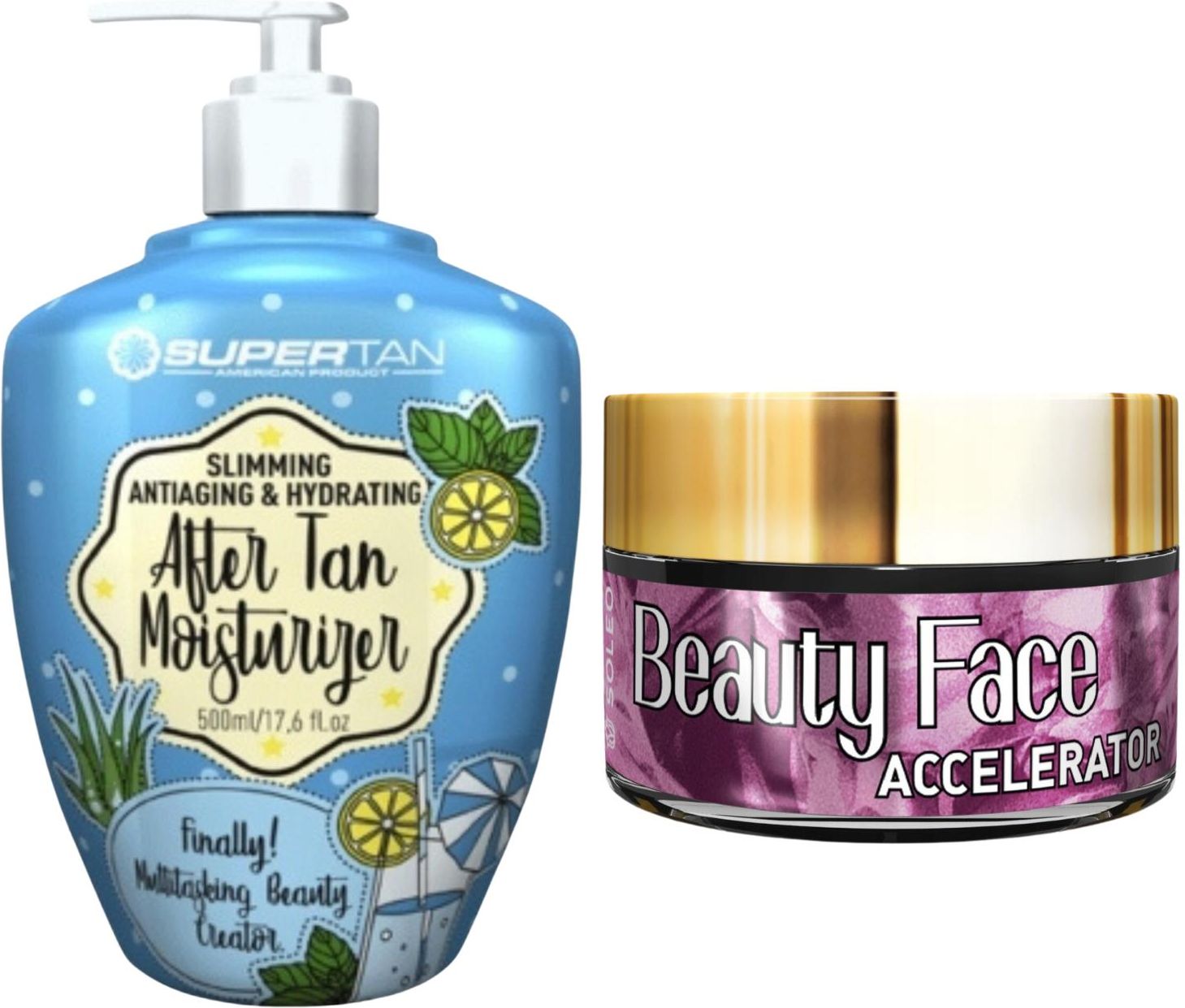 Supertan After Tan + Słoiczek Beauty FaceSupertan After Tan Balsam Po Opalaniu 500mlUmiemy spełniać jej pragnienia o gładkości, jędrności, idealnym nawilżeniu, regeneracji i wzmocnieniu. Jak?Za sprawą wyselekcjonowanych składników: sok z aloesu, masło Shea i kakaowe, olej z konopi, zielona herbatę, witaminy z grupy B, które poprawiają funkcjonowanie skóry, zatrzymują wodę w tkankach oraz wzmacniają barierę naskórkową.Dodatkowo kofeina wspomaga mikrokrążenie i spalanie trójglicerydów, aby jednocześnie wpływać na zmniejszenie skórki pomarańczowej.Poczuj radość z tego, że codzienność pachnie teraz delikatną śmietanką, że skóra odzyskuje świetną formę, że jest doskonale nawilżona i chroniona przed przyspieszonym starzeniem.Etap V – dla wszystkich osób pragnących prawdziwie skutecznie troszczyć się o skórę ciała niezależnie od jej stopnia opalenia czy regularności uczęszczania na sesje w solarium.Oprócz tego, że utrzymują odpowiedni poziom nawilżenia skóry, także przyspieszają proces jej brązowienia, jednocześnie chroniąc i pielęgnując – w rezultacie skóra jest w dobrej kondycji, ciemniejsza, a efekty widoczne już podczas pierwszych sesji opalania.Zapach: delikatna śmietankaPojemność: Butelka 500 mlPolecany dla osób, których skóra jest wrażliwa i wysuszonaSoleo Beauty Face Accelerator PrzyspieszaczBeauty face accelerator intensywnie nawilżający przyspieszacz opalania twarzy, szyi i dekoltu z kolagenem. Mix składników przeciwstarzeniowych i łagodzących sprawia, że skóra wygląda promiennie i młodo.Beauty face stymuluje naturalny proces melanogenezy i przedłuża trwałość opalenizny. Szybko się wchłania, pozostawia elastyczną, nawilżoną i piękną skórę.Zapach: pink flowersPojemność: 15 mlSkładnikiTyrozyna – przyspiesza opalanieAloes & ekstrakt z rumianku – intensywnie nawilżają i działają łagodzącoKolagen regeneruje i uelastycznia skórę, działa przeciwstarzeniowoSposób użycia: Nanieś równomierną warstwę przyspieszacza na powierzchnię twarzy i dekoltu bezpośrednio przed sesją w solarium. Po aplikacji, umyj dokładnie ręce! Pamiętaj, że produkt przeznaczony jest wyłącznie do użytku zewnętrznego. Stosuj każdorazowo przed wizytą w solarium.Dla vegan, wolny od parabenów.Produkt nie testowany na zwierzętach.