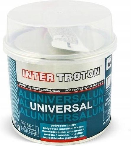 Inter-Troton Universal wypełniająca szpachlówka poliestrowa 450g żółta Zastosowanie Naprawy samochodowe: idealna do wypełniania średnich i większych ubytków oraz nierówności w karoserii. Uniwersalne zastosowanie: może być stosowana na różnych powierzchniach, takich jak stal, aluminium czy ocynkowane elementy, po odpowiednim przygotowaniu podłoża. Szerokie zastosowanie: doskonała do napraw elementów o średnim i niewielkim stopniu uszkodzeń. Właściwości Kremowa konsystencja: ułatwia aplikację i formowanie. Łatwe mieszanie: zapewnia wygodę użytkowania. Wysoka jakość szlifowania: po wyschnięciu umożliwia uzyskanie gładkiej powierzchni. Niska gęstość: umożliwia aplikację na dużych powierzchniach bez obciążania struktury. Parametry techniczne Pojemność: 450 g Kolor: Żółty EAN: 5900763011013 Kod producenta: 1101 Rodzaj: Szpachlówka poliestrowa Stopień połysku: Mat Największe zalety Wszechstronność: idealna do naprawy średnich i dużych ubytków w karoserii. Łatwość aplikacji: kremowa konsystencja ułatwia nakładanie. Gładkie wykończenie: po szlifowaniu uzyskuje się bardzo gładką powierzchnię. Ekonomiczność: niskie zużycie materiału dzięki niskiej gęstości. Idealny dla Warsztatów blacharsko-lakierniczych: do profesjonalnych napraw karoserii. Kierowców: do samodzielnych napraw i konserwacji pojazdów. Majsterkowiczów: do drobnych napraw i prac renowacyjnych. Podłoża Produkt wykazuje bardzo dobrą przyczepność do podłoży różnego rodzaju. Może być aplikowany na: Stal czarną i ocynkowaną oraz aluminium po zmatowaniu i odtłuszczeniu. Przeszlifowane laminaty poliestrowo-szklane (GFK/GRP), szpachlówki poliestrowe, podkłady akrylowe i epoksydowe oraz stare powłoki w dobrym stanie. Dobrze przeszlifowane stare lub fabryczne powłoki lakieru. Uwaga: Nie aplikować szpachlówek poliestrowych bezpośrednio na podkłady reaktywne, 1-komponentowe produkty akrylowe i nitrocelulozowe. Proces aplikacji Zastosowanie Szpachlówka poliestrowa przeznaczona do napraw karoserii samochodowych. Proporcje mieszania wg wagi Szpachlówka: 100 Utwardzacz: 2 Wymieszać dokładnie aż do uzyskania pasty jednolitego koloru. Mieszać ostrożnie, aby nie zapowietrzyć szpachlówki. Grubość warstwy Szpachlówka może być aplikowana w kilku cienkich warstwach. Po każdej z nich produkt powinien być utwardzony. Nie przekraczać łącznej grubości 3 mm. Czas życia to 4÷6 min. w 20°C Czas utwardzania 20÷30 min. w 20°C. Temperatura poniżej 20°C znacząco wydłuża czas utwardzania produktu. Szlifowanie Szlifowanie zgrubne (na sucho): P80÷P120. Szlifowanie wykończeniowe (na sucho): P120÷P320. Suszenie promiennikiem IR 5÷7 min. fal krótkich, w zależności od grubości warstwy i rodzaju promiennika. Nie przekraczać temperatury 60°C. Stosować według zaleceń producenta sprzętu. Odczekać około 5 min. przed rozpoczęciem suszenia promiennikiem. Dalsze prace Na szpachlówki poliestrowe można aplikować: 2-komponentowe szpachlówki poliestrowe, 2-komponentowe poliestrowe szpachlówki natryskowe. 2-komponentowe podkłady akrylowe. 2-komponentowe podkłady epoksydowe. Uwagi ogólne Nadmierna ilość utwardzacza może spowodować problemy z odbarwieniem lakieru bazowego/nawierzchniowego! Podczas pracy z produktami 2-komponentowymi zaleca się używać sprzętu ochrony osobistej. Chronić oczy i drogi oddechowe. Pomieszczenia powinny być dobrze wentylowane. Narzędzia powinny być myte bezpośrednio po aplikacji. Uwaga: W celu zachowania bezpieczeństwa należy zawsze postępować zgodnie z instrukcjami zawartymi w karcie MSDS produktu