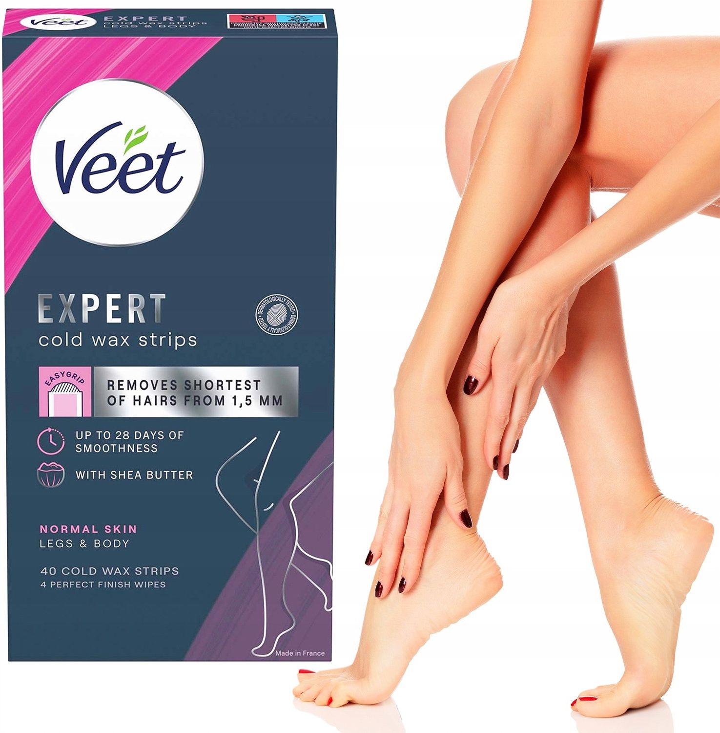Veet Expert Cold Wax Strips 30 szt. - Zimne plastry do depilacji nóg i ciała, skóra normalna Veet Expert Body Wax Strips to gotowe do użycia paski woskowe, które usuwają włoski już od korzenia, gwarantując do 28 dni gładkiej skóry. Dzięki dodatku masła shea doskonale pielęgnują skórę – wygładzają ją i nawilżają, jednocześnie intensywnie oczyszczając powierzchnię naskórka. Paski wyposażone są w wygodną zakładkę Easy‑Grip, która ułatwia aplikację i pozwala precyzyjnie usunąć nawet najkrótsze włoski, już od 1,5 mm, bezproblemowo – również przy pierwszym użyciu.To idealne rozwiązanie dla osób ceniących szybki i trwały efekt – bez wizyty w salonie. Paski są dermatologicznie testowane i sprawdzą się na nogach, rękach, pod pachami oraz w strefie bikini. Użytkownicy chwalą, że efekty utrzymują się nawet do 28 dni, a skóra pozostaje miękka przez długi czas . Główne cechy produktu:Usuwa włosy od korzenia – efekt gładkiej skóry do 28 dniZ masłem shea – pielęgnuje, nawilża i zmiękcza skóręEasy‑Grip – łatwa, precyzyjna aplikacja na pierwsze użycieSkuteczność już przy 1,5 mm długości włosówDermatologicznie testowanePraktyczne wersje: 30 szt. do ciała PARAMETRY TECHNICZNE Liczba pasków: 30 Składnik aktywny: masło shea Obszar użycia: nogi, ręce, pachy, bikini Testowane dermatologicznie Efekt: gładka skóra do 28 dni O marce Veet to światowy lider w dziedzinie produktów do depilacji, obecny na rynku od ponad 100 lat. Marka należy do koncernu Reckitt Benckiser i cieszy się zaufaniem milionów kobiet i mężczyzn na całym świecie. Veet oferuje szeroką gamę produktów do usuwania zbędnego owłosienia – od wosków i kremów, po urządzenia do depilacji elektrycznej. Innowacyjne formuły są opracowywane z myślą o różnych typach skóry, w tym wrażliwej, zapewniając skuteczność i komfort użytkowania. Produkty Veet powstają we współpracy z dermatologami, by spełniać najwyższe standardy jakości i bezpieczeństwa.Wybierając Veet, stawiasz na sprawdzoną skuteczność i delikatność dla skóry. Dołącz do milionów zadowolonych użytkowniczek i ciesz się idealnie gładką skórą każdego dnia