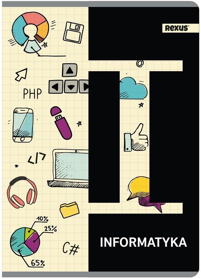 Opakowanie zbiorcze. Zeszyt A5, posiada 60 kartek o gramaturze 70 g/m2 w kratkę. Charakteryzuje się estetycznym wykończeniem i modną okładką tematyczną Informatyka.