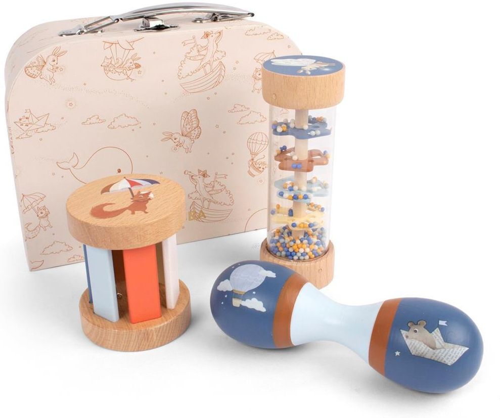 Zapoznaj swoje dziecko z cudami dźwięku i ruchu dzięki temu wspaniałemu zestawowi drewnianych zabawek sensorycznych od Filibabba. Zaprojektowany z myślą o małych rączkach i ciekawskich umysłach, zestaw ten inspiruje maluchy do odkrywania rytmu, tekstury i dźwięku w angażujący i stymulujący sposób. Idealny do wspierania wczesnego rozwoju sensorycznego, tworzy cenne chwile radości zarówno dla niemowląt, jak i rodziców. Zabawki sensoryczne są starannie zapakowane w wytrzymałą tekturową walizkę z solidnymi metalowymi uchwytami i zawiasami. Ta pięknie zadrukowana walizka nie tylko utrzymuje wszystko w porządku, gdy nie jest używana, ale jest również idealna na przygody w podróży. Jej uroczy design dodaje dekoracyjnego akcentu do pokoju dziecięcego lub pokoju zabaw, łącząc funkcjonalność ze stylem. Cechy szczególne Zawiera 3 zabawki sensoryczne: podwójną marakanę, drewnianą grzechotkę z dzwoneczkiem i grzechotkę deszczową. Wykonane z wysokiej jakości drewna brzozowego i schima, zapewniającego trwałość i bezpieczeństwo. Dostarczane w wytrzymałej tekturowej walizce z metalowymi uchwytami i zawiasami ułatwiającymi transport i przechowywanie. Zachęca do rozwoju sensorycznego poprzez dźwięk, teksturę i ruch. Odpowiedni dla niemowląt od 6 miesiąca życia, co czyni go idealnym prezentem dla dzieci na wczesnym etapie rozwoju. Każda zabawka w tym zestawie została zaprojektowana tak, aby urzekać i angażować, zapewniając dziecku nieskończone możliwości nauki i rozwoju. Podwójna maraka oferuje wspaniałe wrażenia rytmiczne, podczas gdy drewniana grzechotka z dzwoneczkiem wprowadza radość dźwięku. Grzechotka rainmaker z kojącą kaskadą koralików stymuluje zmysły słuchu i hipnotyzuje delikatnym ruchem. Niezależnie od tego, czy jesteś w domu, czy w podróży, ten zestaw zabawek sensorycznych jest idealnym towarzyszem podróży rozwojowej Twojego dziecka. Zachęcaj do eksploracji i zabawy tymi pięknie wykonanymi zabawkami, które obiecują być cenną częścią wczesnych lat życia Twojego dziecka.