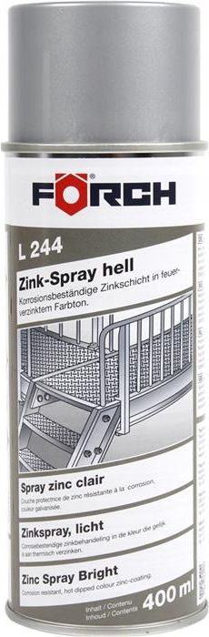 FORCH L244 CYNK SPRAY CYNKOWY JASNY 400 ML _________________________________________ Opis produktu: szybkoschnąca, odporna na korozję powłoka cynkowa w odcieniu ocynku ogniowego do zabezpieczania przed korozją oraz polepszania wyglądu metalicznych powierzchni aktywna ochrona antykorozyjna wg DIN …
