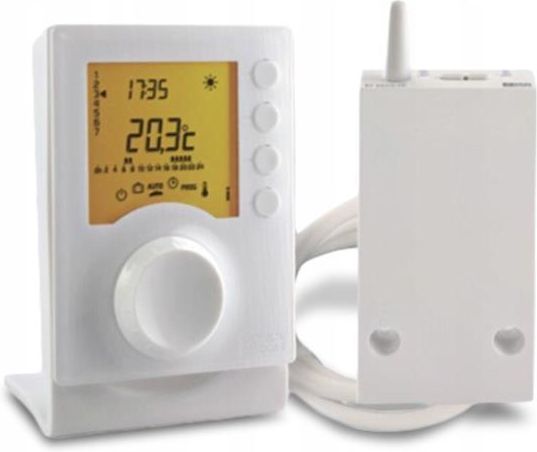 Termostat elektroniczny z programowaniem tygodniowym Do rewersyjnej pompy ciepła radiowy - bezprzewodowy TYBOX 437 DD6053027 Immergas Termostat TYBOX 437 to radiowy, programowalny termostat elektroniczny Z programowaniem tygodniowym przeznaczony do współpracy z rewersyjną pompą ciepła. Delta Dore Tybox 437 to zaawansowany, bezprzewodowy sterownik tygodniowy umożliwiający zdalne zarządzanie systemami grzewczymi i klimatyzacyjnymi w domach i budynkach, wyposażony w funkcje automatycznego dostosowywania pracy urządzeń do zmieniających się warunków termicznych, możliwość programowania temperatury w poszczególnych dniach tygodnia oraz zdalne odczytywanie i kontrolowanie stanu systemu za pomocą smartfona lub tabletu. Najważniejsze cechy regulacja PI lub histereza programowanie dzienne lub tygodniowe wybór pomiędzy 2 temperaturami ustawianymi od 5 do 30 °C : Komfort, Ekonomiczna w trybie Grzanie/Chłodzenie wyjście zmiany trybu pracy (grzanie chłodzenie) na pompie ciepla szybki wybór odrębnych programów dzięki regulacji za pomocą pokrętła: Włącz/Wyłącz/Automatyczny program wakacyjny z wbudowanym kalendarzem przypomnienie o rocznym przeglądzie serwisowym automatyczna zmiana czasu : lato/zima wyświetlanie temperatury otoczenia podświetlany ekran funkcja zablokowania ustawień Dane techniczne Producent: IMMERGAS Kod producenta: DD6053027 Kod EAN: 3513140530278 Model: TYBOX 437 Produkt: termostat tygodniowy Rodzaj: radiowy Zakres: od 5 do 30°C Przeznaczenie: pompy ciepła Wymiary: 80 x 103 x 25 mm Zasilanie: 2 baterie AAA (LR03) 1,5 V