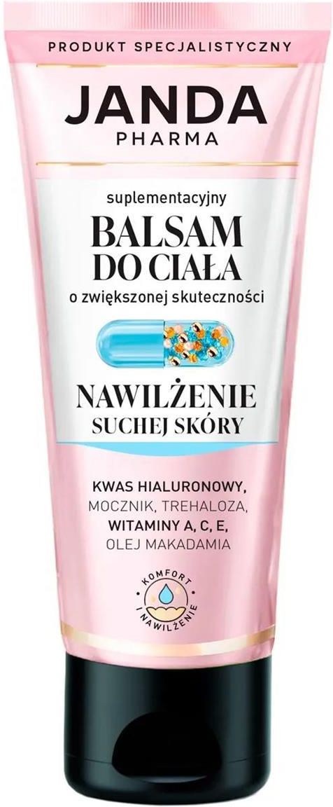 Specjalistyczny balsam nawilżający przeznaczony do pielęgnacji szorstkiej, suchej skóry z tendencją do podrażnień. Kwas hialuronowy, mocznik, trechaloza, witamina A, C, E oraz olej makadamia tworzą niezwykłą mieszankę, która przynosi ukojenie suchej skórze oraz łagodzi podrażnienia. Balsamy suplementacyjne bazują na technologii DDS, która wykorzystuje biomimetyczne mikrokapsułki, które to dostarczają aktywne składniki z ponadprzeciętną skutecznością. Kosmetyk polecany jest szczególnie na suche partie tj. kolana, łokcie, dłonie i stopy. •Przeznaczony do suchej i szorstkiej skóry •Oparty na technologii DDS •Intensywnie i głęboko nawilża •Łagodzi podrażniania •Przynosi ukojenie suchej skórze •Zawiera kwas hialuronowy •Zapewnia ponadprzeciętną skuteczność •Przeznaczony do codziennego stosowania •Posiada delikatny, kremowy zapach Sposób użycia: Na osuszoną skórę ciała, zwłaszcza części narażonych na szczególne wysuszenie, nałóż balsam, po czym wmasuj do całkowitego wchłonięcia. Stosuj rano i wieczorem. Rezultat: Nawilżona, ukojona skóra całego ciała. Janda to polska marka kosmetyczna, która powstała z inspiracji energią, pasją i doświadczeniem jednej z najbardziej znanych aktorek – Krystyny Jandy. Marka wyróżnia się filozofią opartą na połączeniu nauki i sztuki w trosce o piękno oraz zdrowie skóry. Produkty Janda są tworzone w Polsce, we współpracy z ekspertami z dziedziny dermatologii, biotechnologii i chemii kosmetycznej, co zapewnia ich skuteczność i bezpieczeństwo. Oferta marki obejmuje szeroką gamę kosmetyków do pielęgnacji twarzy, ciała oraz specjalistyczne produkty przeciwstarzeniowe. Charakterystyczną cechą produktów jest ich bogate działanie odżywcze, regenerujące i nawilżające, a także luksusowe formuły i eleganckie opakowania.