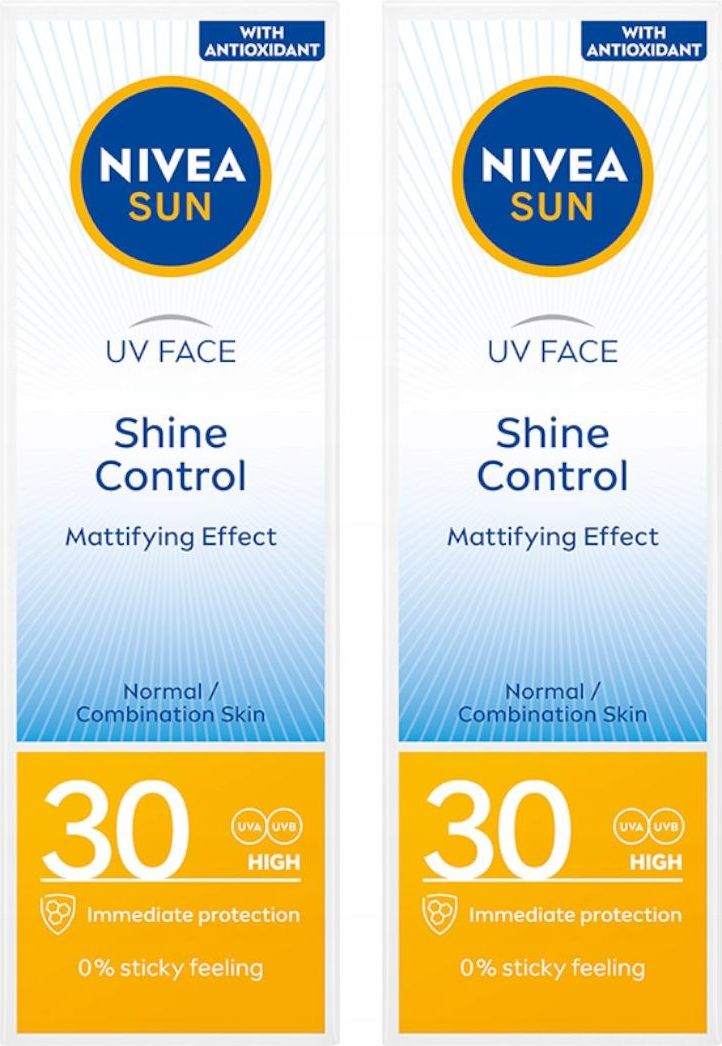 NIVEA SUN Matujący krem do twarzy z wysoką ochroną SPF 30, 50 ml x 2 szt NIVEA SUN SHINE CONTROL MATUJĄCY KREM DO TWARZY SPF 30, 50ML Zapewnij skórze matowe wykończenie, także podczas letnich dni! Matujący krem do twarzy z filtrem SPF 30 NIVEA SUN UV Face Shine Control to pielęgnująca formuła, …