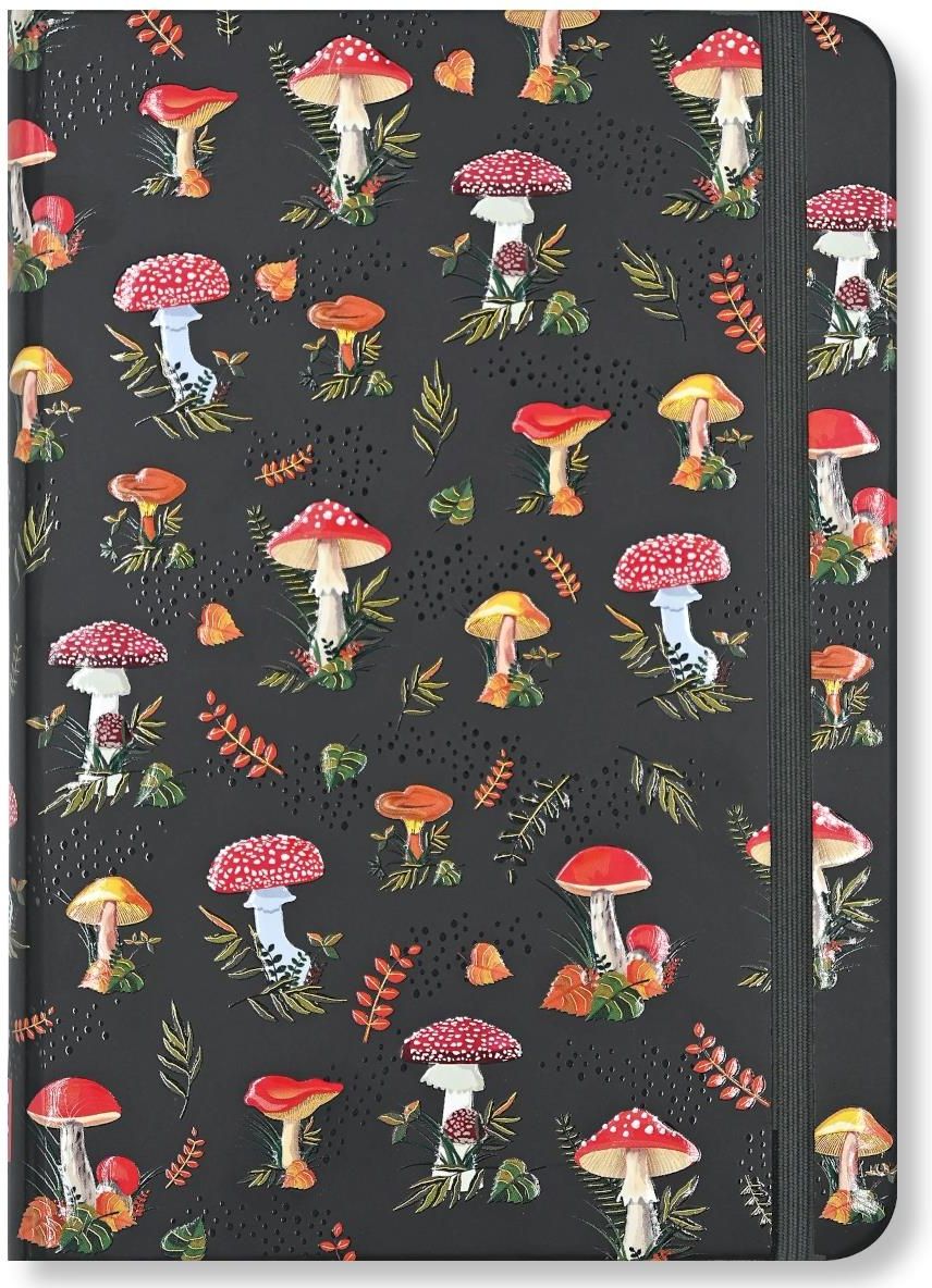 Mały notatnik firmy Peter Pauper Press - Grzyby (Mushrooms) Każdy notes tej marki jest wyjątkowym dziełem sztuki. Bogactwo wzorów i kolorów pozwala wybrać ten idealny. Notes idealnie nadaje się na prezent. Grzyby na okładce są lekko wypukłe oraz błyszczące, co świetnie komponuje się z matowym, czarnym tłem. Szczegóły: okładka sztywna, wytłaczana, opalizująca, zdobiona złotą folią notes jest zszywany, a po otwarciu leży płasko ułatwia to pisanie zamknięcie na gumkę na końcu koperta na luźne notatki, wizytówki, itp. kartki wykonane z wysokiej jakości papieru bezkwasowego niezwykle trwałe, z cechami gwarantującymi długi czas użytkowania gramatura 120 gsm zadruk w jasnoszare linie, dwustronny, na lekko kremowym papierze wymiary: 12,7cm x 17,8 cm format zbliżony do B6 ilość stron: 160