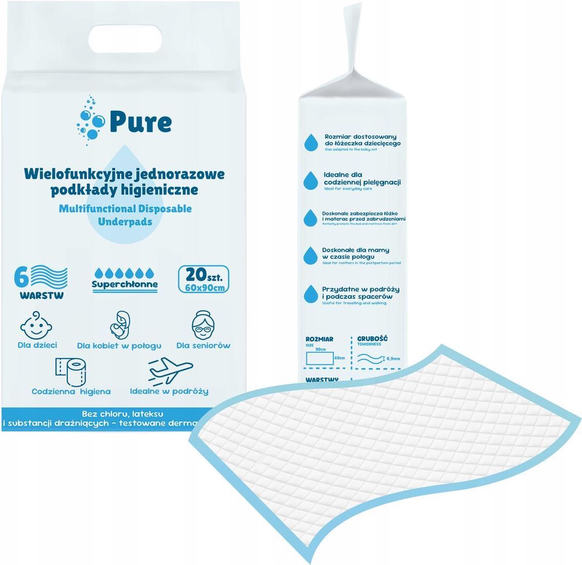 Podkłady higieniczne 6-warstwowe – Twoja pewność czystości i komfortu! Nie ryzykuj przecieków – wybierz podkłady higieniczne, które naprawdę działają! Nasze 6-warstwowe podkłady to gwarancja maksymalnej ochrony, wygody i higieny w każdej sytuacji. Dlaczego warto wybrać nasze podkłady? 6 warstw ochronnych – zatrzymują wilgoć i chronią powierzchnię przed przeciekaniem Superchłonny wkład – błyskawicznie wchłania płyny, zapewniając uczucie suchości Miękka, delikatna powierzchnia – bez podrażnień, idealna dla skóry dziecka i dorosłych Nieprzemakalny spód – pełna ochrona łóżka, przewijaka, fotela czy wózka Jednorazowe i higieniczne – zawsze czysto, zawsze wygodnie Opakowanie: 20 sztuk – zawsze pod ręką, gdy liczy się bezpieczeństwo! Idealne zastosowanie Podczas przewijania niemowląt W okresie połogu i rekonwalescencji Jako ochrona materaca, pościeli czy fotela W podróży – lekkie, zajmują mało miejsca Dla osób starszych lub leżących – wsparcie przy inkontynencji Dane techniczne Struktura: 6 warstw chłonnych i ochronnych Wkład: superabsorbent o wysokiej chłonności Spód: folia nieprzemakalna Kolor: niebieski Rozmiar: 60 × 90 cm Ilość w opakowaniu: 20 sztuk Pure – pewna ochrona dla Ciebie i Twojej rodziny Produkty marki Pure powstały z myślą o najwyższym poziomie jakości i bezpieczeństwa. Nasze podkłady higieniczne zostały zaprojektowane tak, aby sprostać wymaganiom zarówno dzieci, jak i dorosłych. Dzięki 6-warstwowej strukturze oraz starannie dobranym, przebadanym materiałom, zapewniają skuteczną ochronę przed wilgocią, komfort i higienę w każdej sytuacji. Dlaczego warto nam zaufać? Bezpieczne materiały – wykonane z delikatnych, nietoksycznych tworzyw, odpowiednich nawet dla wrażliwej skóry Kontrola jakości – każda partia jest testowana pod kątem chłonności i trwałości Bez lateksu i drażniących dodatków – brak zapachów i substancji mogących powodować podrażnienia Polska marka – tworzymy produkty z troską o codzienny komfort Twojej rodziny