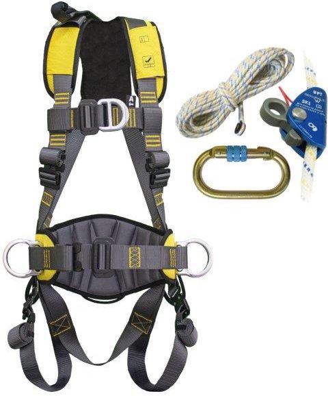 Zestaw asekuracyjny dla Fotowoltaiki - urządzenie samozaciskowe + szelki IRUDEK 100Urządzenie samozaciskowe LINOSTOPLina robocza poliamidowa:średnica 10,5 mm długość 20mLina robocza z jednej strony zakończona pętlą z kausząMechanizm zaciskowo-przesuwny wykonany ze stali nierdzewnejUrządzenie LINOSTOP jest składnikiem indywidualnego sprzętu chroniącego przed upadkiem z wysokości zgodnym z normą EN 353-2. Środki ochrony indywidualnej chroniące przed upadkiem z wysokości.Część 2: Urządzenie samozaciskowe z giętką prowadnicą.Szelki bezpieczeństwa EXPERT 100Z 1 grzbietowym punktem zaczepowym i regulowaną taśmą 1 mostkowy punkt zaczepowy Pas do ustalania pozycji przy pracy obrotowy 180º z 2 pierścieniami „D” bocznymi i pierścieniami do mocowania narzędziRegulowanena ramionach i udachTaśmypiersiowaelastyczna na ramionachbiodrowa Wyściełane nogawkiSprzączki z szybkim zamknięciem, automatycznympierścienie z kutego aluminiumSzelki pakowane w torbę nylonowąRozmiar: L-XXLSzelki spełniają wszystkie wymogi norm w dyrektywie europejskiej, jako osobisty sprzęt zabezpieczający (PPE) - EN 358: 1999 (szelki bezpieczeństwa z pasem ustalającym pozycję przy pracy)- EN 361: 2002 (szelki bezpieczeństwa) - EN 813: 1997 (szelki bezpieczeństwa z pasem ramieniowym)EN 358:Indywidualny sprzęt ochrony ustalający pozycję podczas pracy i zapobiegający upadkom z wysokości. Pasy ustalające pozycję podczas pracy i ograniczające przemieszczanie oraz linki ustalające pozycję podczas pracy.Norma opisuje pasy i linki przeznaczone do ustalania pozycji podczas pracy lub ograniczające przemieszczanie.Norma określa wymagania dotyczące projektowania i konstrukcji pasa biodrowego, linki ustalającej pozycję podczas pracy, łączników i odporności na zapalenie.EN 361:Indywidualny sprzęt chroniący przed upadkiem z wysokości. Szelki bezpieczeństwa.Norma definiuje wymagania, metody badań, zasady znakowania. Informacje wymagane od producenta oraz sposób pakowania dla szelek bezpieczeństwa.EN 813:Indywidualny sprzęt chroniący przed upadkiem z wysokości. Uprzęż biodrowa.Norma definiuje wymagania, metody badań, zasady znakowania i informacje, które powinny być dostarczone przez producenta, dla uprzęży biodrowych przeznaczonych do użycia w systemach nadawania pozycji podczas pracy i uniemożliwiających spadanie, w których jest wymagany dolny element zaczepowy.