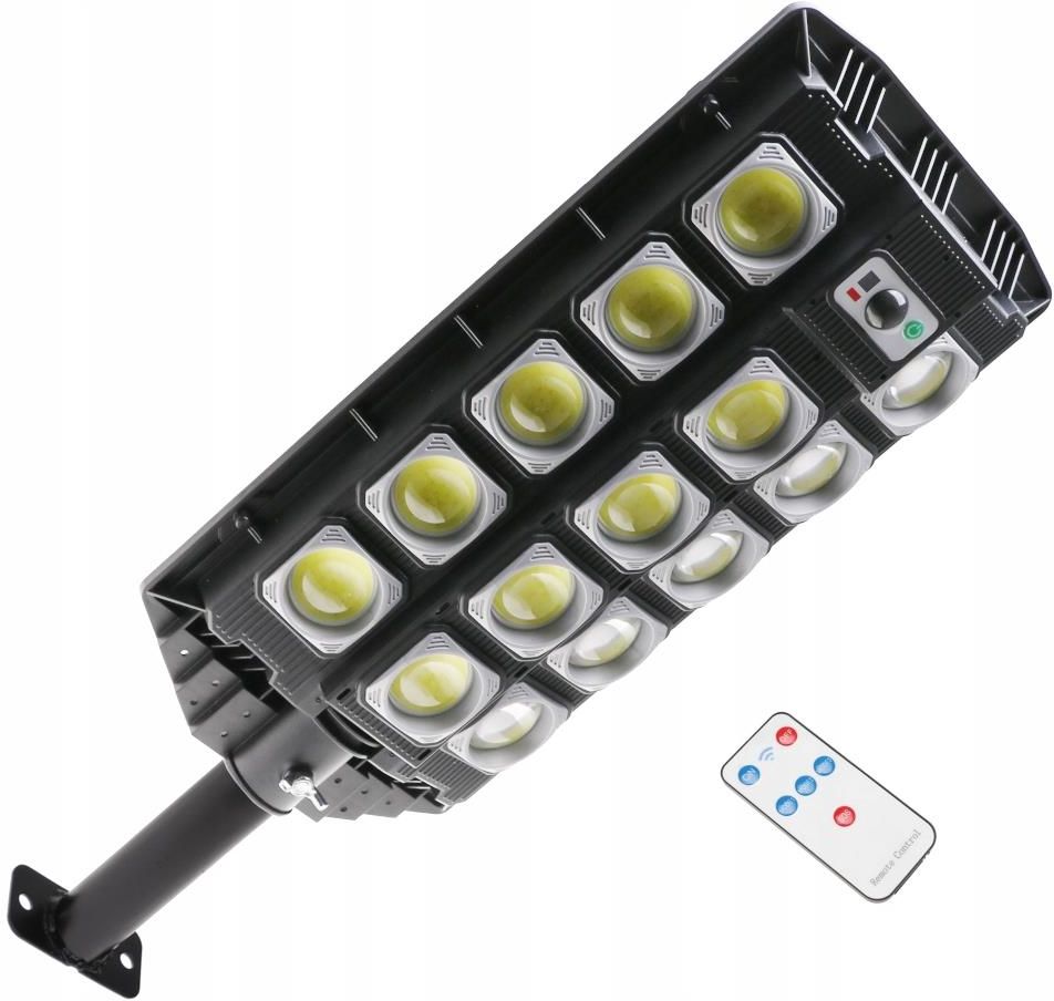 Lampa uliczna z czujnikiem zmierzchu i ruchu Ekologiczny i energooszczędny sposób oświetlenia Cechy produktu: Lampa zasilana energią słoneczną - jest ekologiczna i energooszczędna, zużywa 10 razy mniej energii niż tradycyjne oświetlenie Najnowszej generacji panel solarny monokrystaliczny - silikonowy zapewnia ładowanie akumulatora nawet w pochmurne dni. Akumulator o sprawia, że latarnia może świecić całą noc - w zależności od pogody. Czujnik zmierzchu (w solarze) załączy lampę po zmroku i wyłączy o świcie. Wyposażona w diody COB Idealnie oświetli parking, plac budowy, ulicę, alejkę parkową. Nadaje się przed garaż, magazyn, w gospodarstwach rolnych i agroturystyce. Obudowa wykonana z tworzywa Wbudowany czujnik światła / zmierzchu Wbudowany czujnik ruchu Lampa jest wodoodporna i odporna na wstrząsy Instalacja nie wymaga okablowania, lampa posiada wbudowany akumulator 3 tryby świecenia W zestawie pilot, stojak oraz śruby do montażu Specyfikacja: Kąt wychwytywania ruchu: 120° Moc: 300 W Barwa światła: zimna biała Wymiary lampy: 34 x 18 x 5,5 cm Długość z uchwytem: 48 cm 11 paneli świetlnych Czas świecenia przy pełnym naładowaniu: do 12 godzin Każdy panel posiada diody COB Tryby świecenia: MODE1 - Lampa jest wyłączona, po zmierzchu i wykryciu ruchu włącza się pełna moc MODE2 - Lampa po zmroku włącza 30% mocy, po wykryciu ruchu włącza się pełna moc MODE3 - Lampa po zmroku włącza 50% mocy