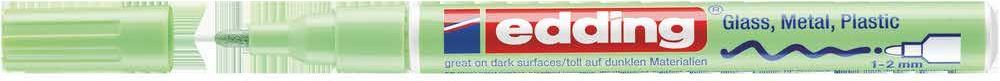 MARKER OLEJOWY POŁYSKUJĄCY E-751 EDDING, 1-2 MM, ZIELONY PASTELOWY Połyskujący marker olejowy do trwałego, wysoce kryjącego, odpornego na ścieranie pisania i dekorowania gładkich powierzchni - również ciemnych lub transparentnych, np. szkła, metalu, plastiku i szkła powlekanego Okrągła końcówka …