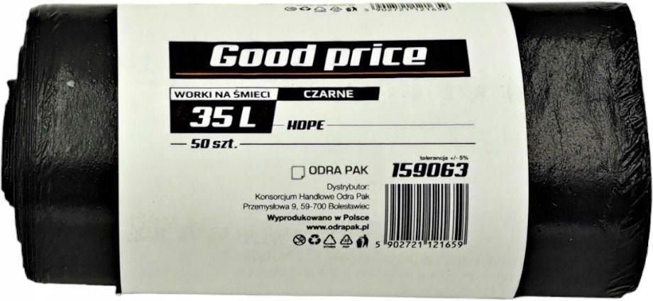 Worki na śmieci 35 L Good Price czarne HD 50 worków na rolce rozmiar: 48x57 cm Worki na śmieci HDPE są bardzo mocne i wytrzymałe, niezbędne w każdej Firmie i domu na odpadki i śmieci. Zapewniają komfort i bezpieczeństwo. Worki przeznaczone są do pakowania śmieci, odpadów oraz segregacji ale mogą być wykorzystywane do wielu innych celów np. ochrony różnego rodzaju przedmiotów przed wilgocią. Cena za 1 rolkę (50 worków) Odra Pak 159063