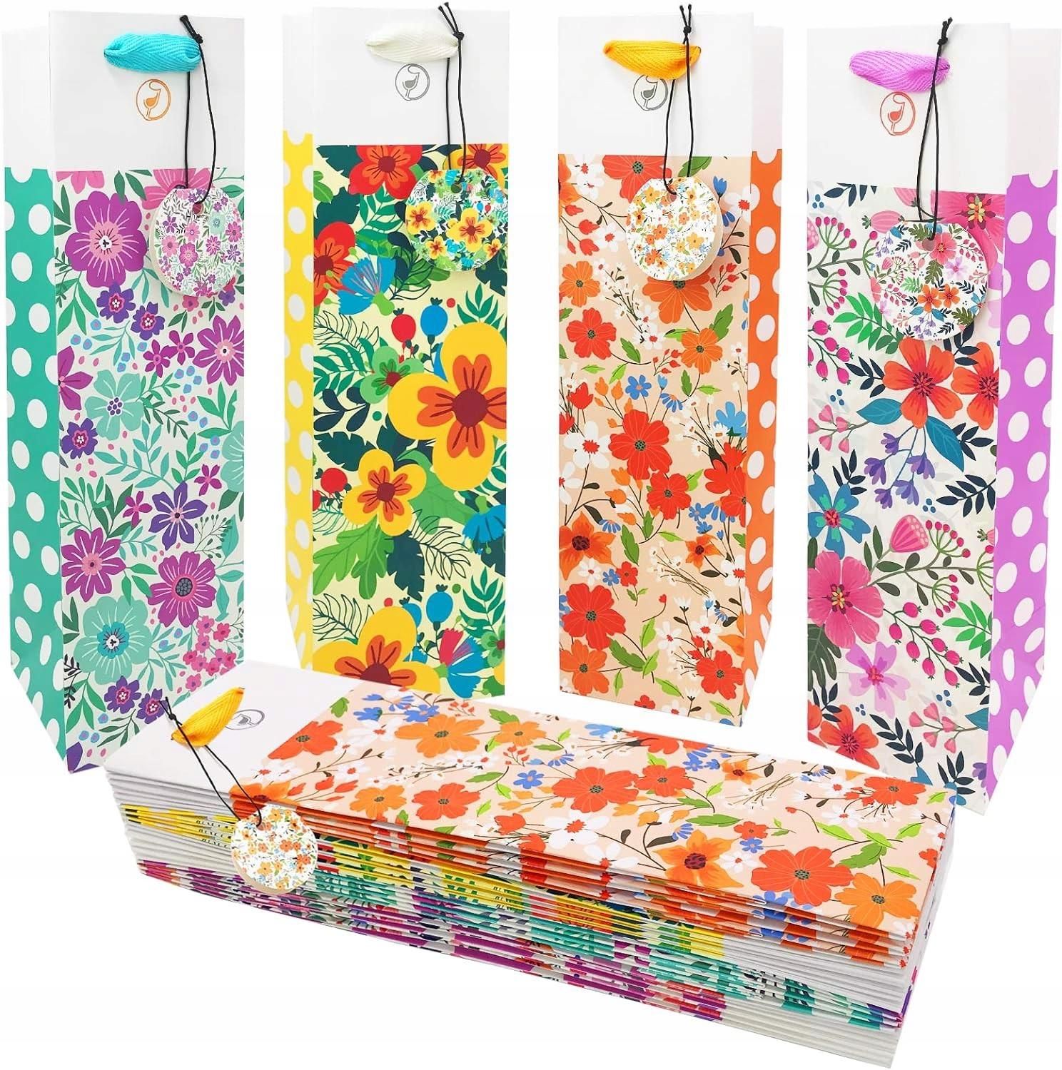 Torebki Prezentowe na Wino Butelkę 12szt Produkt fabrycznie nowy, nieużywany w oryginalnym opakowaniu. 12 torebek na wino z wytrzymałą, matową laminacją, łącznie w 4 uroczych kolorach, łączących unikalne motywy kwiatowe w kropki: niebieski, żółty, różowy, fioletowy. 3 worki każdego koloru. …