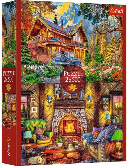 Trefl Puzzle 2x500el. Wycieczka w góry 37534 Puzzle 2x500 to aż dwie układanki 500 elementów w jednym opakowaniu! Wycieczka w góry to puzzle przedstawiające dom na tle gór i wnętrze chaty z kominkiem. Każda z układanek pozwoli stworzyć obrazek o wymiarach 480x340 mm. Produkt został wykonany w …