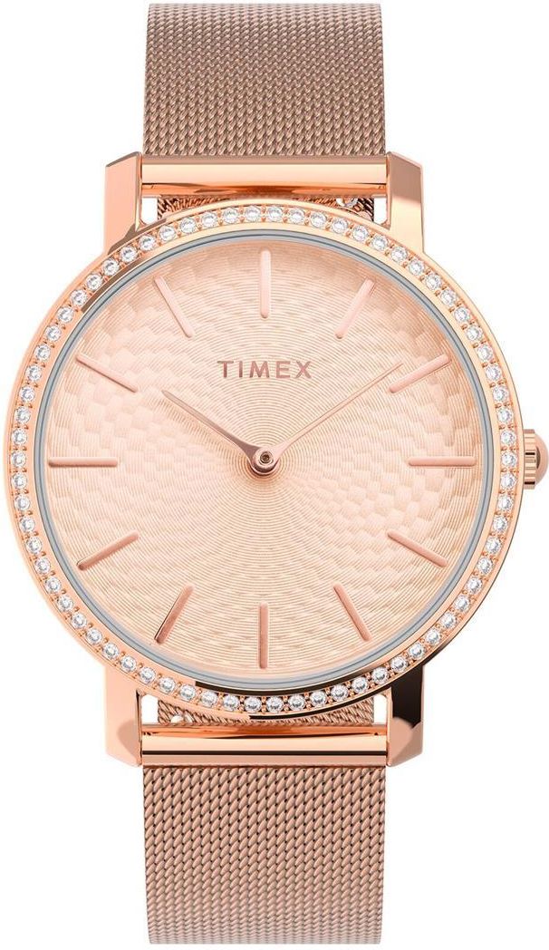 Timex TW2V52500 City Zegarek damski Timex TW2V52500 City to wyjątkowy model, który łączy w sobie elegancję oraz nowoczesne rozwiązania. Dzięki swojej klasycznej stylistyce utrzymanej w różowo-złotej tonacji, z subtelnymi kryształkami na obwodzie koperty, ten czasomierz stanie się doskonałym dodatkiem do każdej stylizacji. Oferując nie tylko funkcjonalność, ale także estetykę, model ten z pewnością przyciągnie wzrok i podkreśli kobiecy urok. Wybierając ten zegarek, warto zwrócić uwagę na kluczowe cechy, które mogą wpłynąć na decyzję o zakupie. Typ zegarka Zegarek damski firmy Timex to przykład eleganckiego modelu analogowego, który doskonale łączy klasykę z nowoczesnością. W przeciwieństwie do zegarków cyfrowych, które prezentują czas w formie cyfr, zegarki analogowe korzystają z tradycyjnych wskazówek. Tego rodzaju mechanizm nadaje elegancji i sprawia, że zegarek staje się bardziej wyszukanym dodatkiem. Model ten wykorzystuje niezawodny mechanizm kwarcowy, co zapewnia dużą precyzję oraz długotrwałe użytkowanie. Mechanizm W cenionym zegarku Timex zastosowano mechanizm kwarcowy, zasilany baterią. Tego typu mechanizmy cieszą się uznaniem ze względu na swoją niezawodność i niskie zużycie energii, co sprawia, że zegarek wymaga minimalnej konserwacji. Mechanizmy kwarcowe gwarantują również dokładność, dzięki czemu możesz być pewny, że zawsze będziesz na czas. Materiał koperty Koperta zegarka wykonana jest z wysokiej jakości metalu w odcieniu różowego złota, co nadaje mu elegancki oraz nowoczesny wygląd. Tego rodzaju materiał nie tylko wpływa na estetykę, ale także zapewnia trwałość, odporność na uszkodzenia mechaniczne oraz korozję. Model ten z pewnością stanie się niezawodnym towarzyszem przez wiele lat. Szkiełko Zegarek Timex TW2V52500 wyposażono w szkiełko mineralne, które charakteryzuje się wysoką odpornością na zarysowania oraz doskonałą przejrzystością. Tego rodzaju szkło zabezpiecza tarczę przed uszkodzeniami, dzięki czemu pozostaje ona czytelna i estetyczna, co jest istotne w codziennym użytkowaniu. Pasek lub bransoleta Model ten wyposażony jest w bransoletę typu mesh wykonaną ze stali, co zapewnia komfort noszenia oraz elegancki wygląd. Dzięki zastosowaniu zatrzasku, bransoleta łatwo dopasowuje się do obwodu nadgarstka. Dodatkowo, bransoleta została umocowana na teleskopach typu easy click, co umożliwia prostą i szybką wymianę, jeśli zajdzie taka potrzeba. Wymiary Wymiary zegarka są kluczowe przy wyborze odpowiedniego modelu. Zegarek Timex ma średnicę koperty wynoszącą 34 mm oraz grubość zaledwie 7 mm, co czyni go smukłym i subtelnym dodatkiem do każdej stylizacji. Szerokość mocowania wynosi 16 mm, co sprawia, że zegarek idealnie układa się na nadgarstku, zapewniając komfort noszenia. Wodoszczelność Wodoszczelność zegarka ustalona na poziomie 30 metrów (3 ATM) oznacza, że jest odporny na drobne zachlapania, na przykład podczas mycia rąk czy w lekkim deszczu. Warto jednak pamiętać, że model ten nie nadaje się do pływania ani nurkowania, co jest istotne dla osób planujących intensywne użytkowanie w wodzie. Funkcje dodatkowe i parametry Zegarek Timex TW2V52500 oferuje różnorodne funkcje, które zwiększają jego atrakcyjność. Oto kilka z nich: Cyrkonie: subtelne kryształki na obwodzie koperty dodają elegancji i blasku. Gwarancja: 2-letnia gwarancja producenta daje poczucie bezpieczeństwa przy zakupie. Styl: klasyczny design sprawia, że zegarek pasuje do wielu różnych stylizacji. Bransoleta typu mesh: elegancki i modny dodatek podkreślający kobiecy urok. Łatwość wymiany bransolety: teleskopy typu easy click umożliwiają prostą wymianę. Mineralne szkło: zapewnia wysoką odporność na zarysowania.