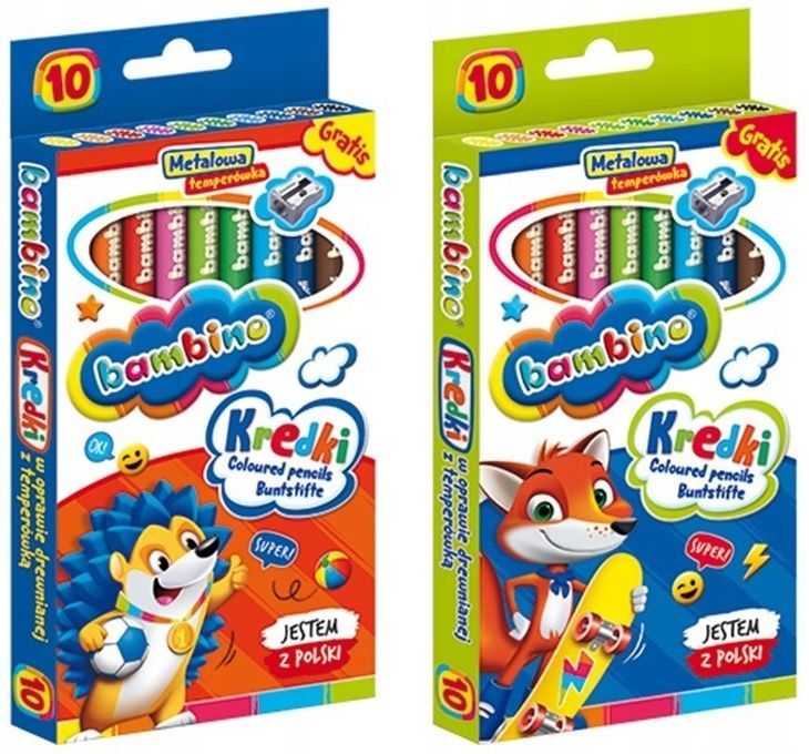 Kredki BAMBINO w oprawie drewnianej z temperówką, 10 kolorów Cechy produktu: wykonane z glinki kaolinowej w drewnianej oprawie produkowane w Polsce łatwe do temperowania miękkie w użyciu intensywne i nasycone kolory doskonale kryją powierzchnię idealne do rysowania, wypełniania dużych płaszczyzn i …