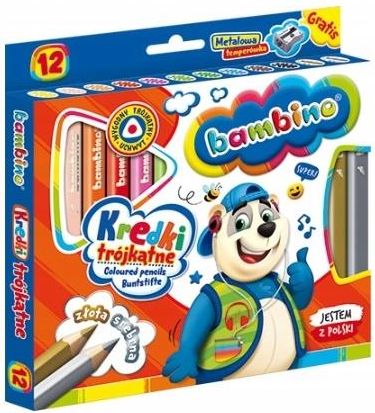 Kredki BAMBINO w oprawie drewnianej o przekroju trójkątnym, 12 kolorów, z temperówką Cechy produktu: wykonane z glinki kaolinowej w drewnianej oprawie o wygodnym trójkątnym przekroju produkowane w Polsce łatwe do temperowania miękkie w użyciu intensywne i nasycone kolory doskonale kryją …