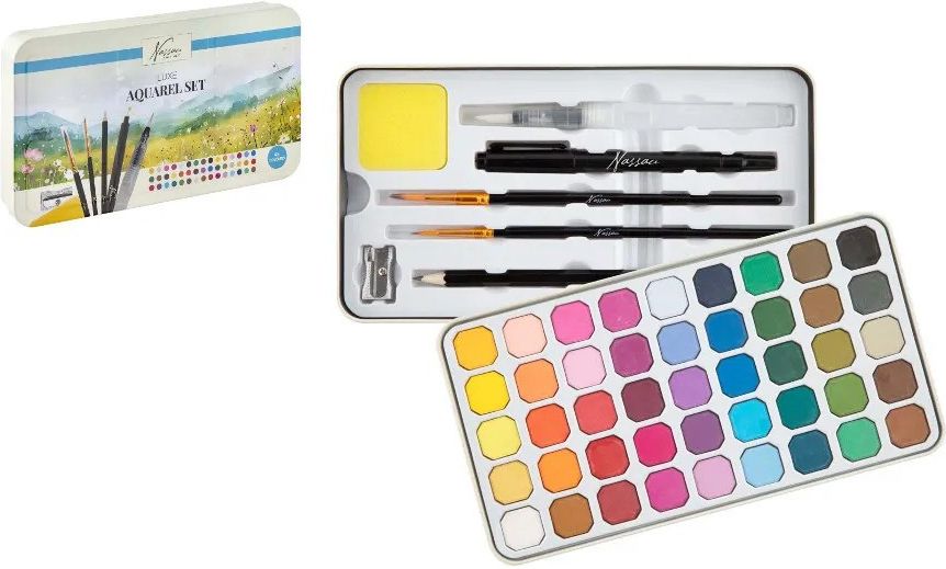 Ten luksusowy zestaw akwareli jest idealny dla młodych artystów, którzy uwielbiają eksperymentować z farbami. Metalowe pudełko do przechowywania zawiera aż 45 wyrazistych odcieni akwareli, uzupełnionych szeroką gamą akcesoriów, takich jak pędzle, ołówek, temperówka, cienkopis, pędzel wodny i gąbka. Wszystko, czego potrzebujesz, aby od razu zacząć malować! Wiek: 3+